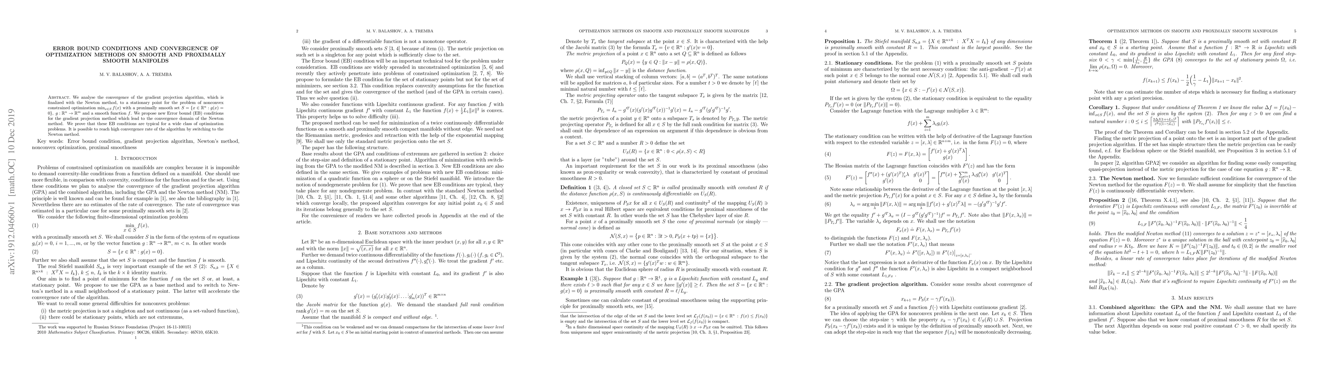 We analyse the convergence of the gradient projection algorithm, which is finalized with the Newton method, to a stationary point for the problem of nonconvex constrained optimization $\min_{x \in S} f(x)$ with a proximally smooth set $S = \{x \in R^n : g(x) = 0 \}, \; g : R^n \rightarrow R^m$ and a smooth function $f$. We propose new Error bound (EB) conditions for the gradient projection method which lead to the convergence domain of the Newton method. We prove that these EB conditions are typical for a wide class of optimization problems. It is possible to reach high convergence rate of the algorithm by switching to the Newton method.