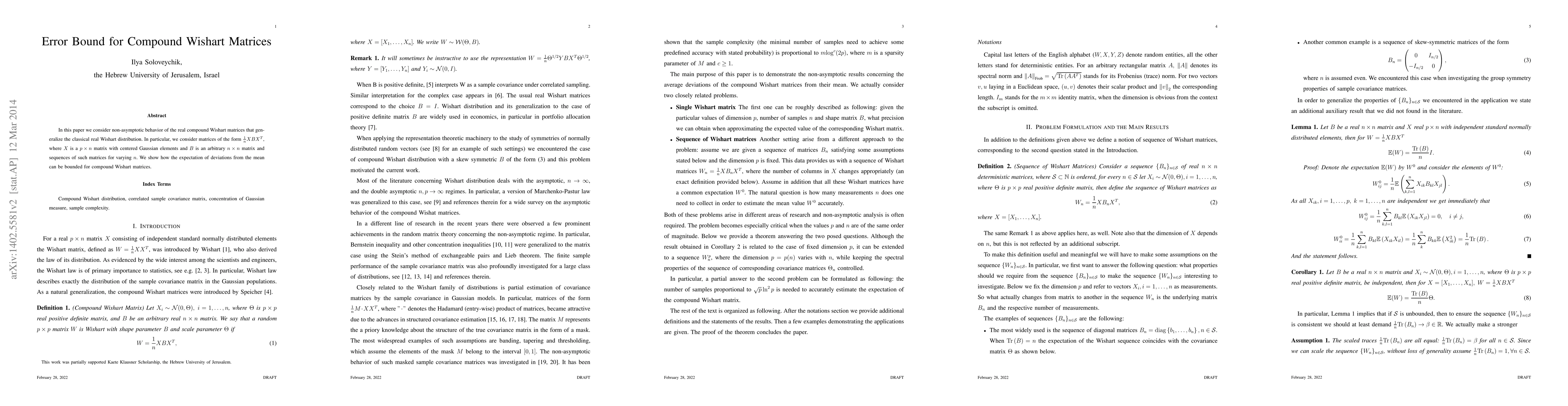 This paper investigates the non-asymptotic behavior of compound Wishart matrices, showing how deviations from their mean can be bounded. It focuses on matrices formed as 1/nXBX' with real centered Gaussian elements and an arbitrary matrix B.