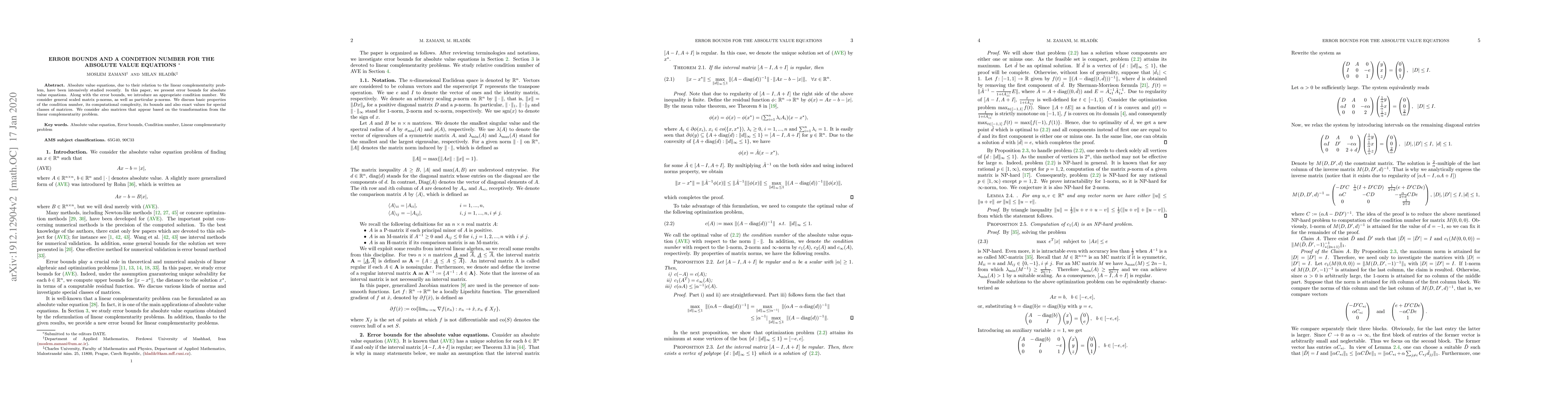 This paper presents error bounds for absolute value equations and introduces a condition number for these equations, considering various matrix norms. It discusses the properties, computational complexity, and bounds of the condition number, particularly for matrices derived from the linear complementarity problem.