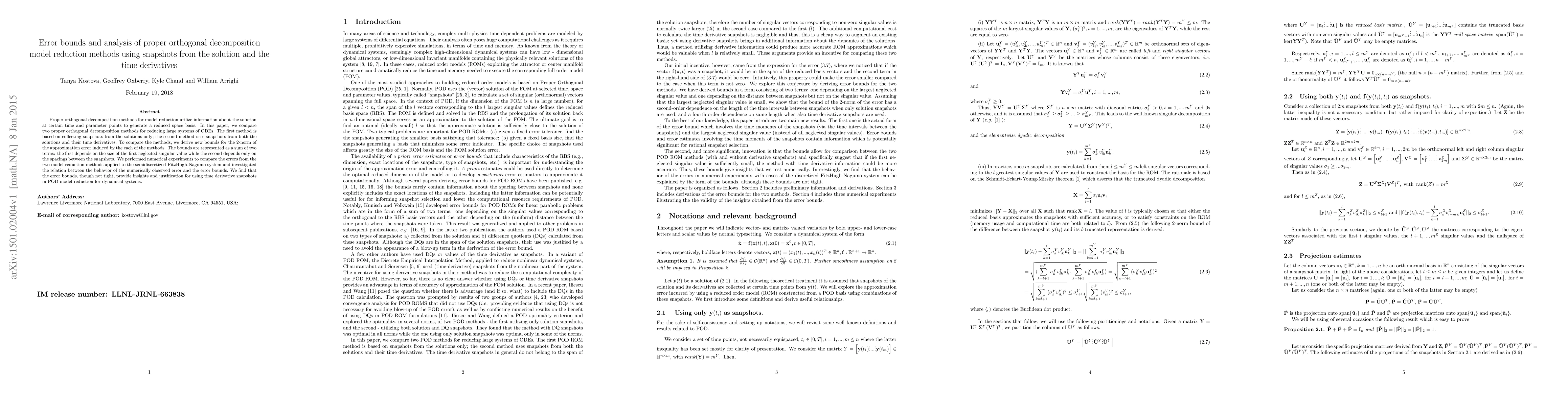 This paper compares two proper orthogonal decomposition methods for model reduction in large systems of ODEs, deriving new error bounds for each. The methods differ in whether they use snapshots from solutions alone or both solutions and their time derivatives, with the latter showing better performance in numerical experiments on the FitzHugh-Nagumo system.