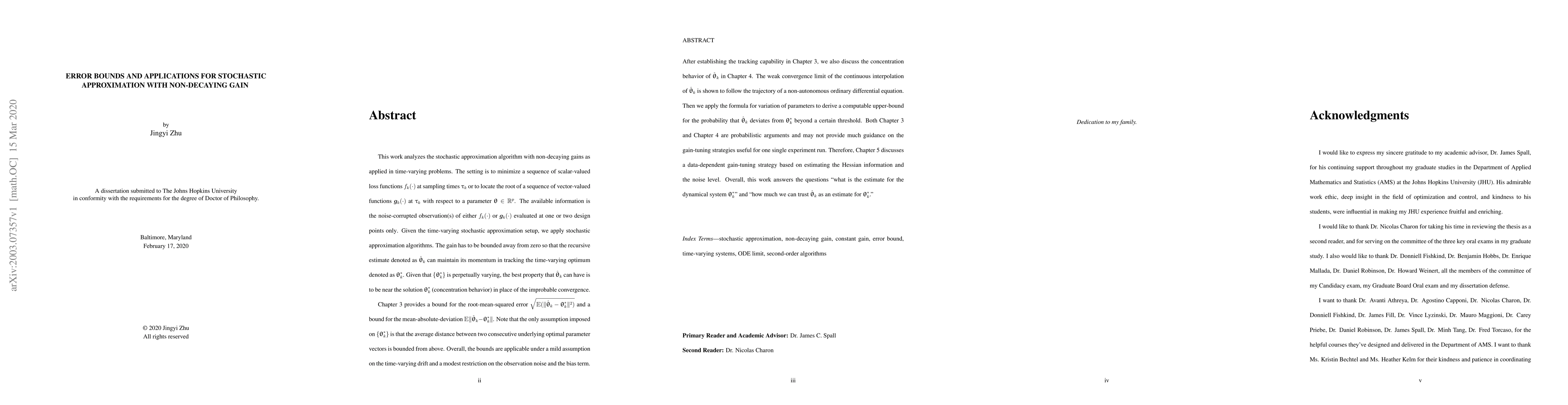 This work analyzes the stochastic approximation algorithm with non-decaying gains as applied in time-varying problems. The setting is to minimize a sequence of scalar-valued loss functions $f_k(\cdot)$ at sampling times $\tau_k$ or to locate the root of a sequence of vector-valued functions $g_k(\cdot)$ at $\tau_k$ with respect to a parameter $\theta\in R^p$. The available information is the noise-corrupted observation(s) of either $f_k(\cdot)$ or $g_k(\cdot)$ evaluated at one or two design points only. Given the time-varying stochastic approximation setup, we apply stochastic approximation algorithms with non-decaying gains, so that the recursive estimate denoted as $\hat{\theta}_k$ can maintain its momentum in tracking the time-varying optimum denoted as $\theta_k^*$. Chapter 3 provides a bound for the root-mean-squared error $ \sqrt{E(\|\hat{\theta}_k-\theta_k^*\|^2})$. Overall, the bounds are applicable under a mild assumption on the time-varying drift and a modest restriction on the observation noise and the bias term. After establishing the tracking capability in Chapter 3, we also discuss the concentration behavior of $\hat{\theta}_k $ in Chapter 4. The weak convergence limit of the continuous interpolation of $\hat{\theta}_k$ is shown to follow the trajectory of a non-autonomous ordinary differential equation. Both Chapter 3 and Chapter 4 are probabilistic arguments and may not provide much guidance on the gain-tuning strategies useful for one single experiment run. Therefore, Chapter 5 discusses a data-dependent gain-tuning strategy based on estimating the Hessian information and the noise level. Overall, this work answers the questions "what is the estimate for the dynamical system $\theta_k^*$" and "how much we can trust $\hat{\theta}_k $ as an estimate for $\theta_k^*$."