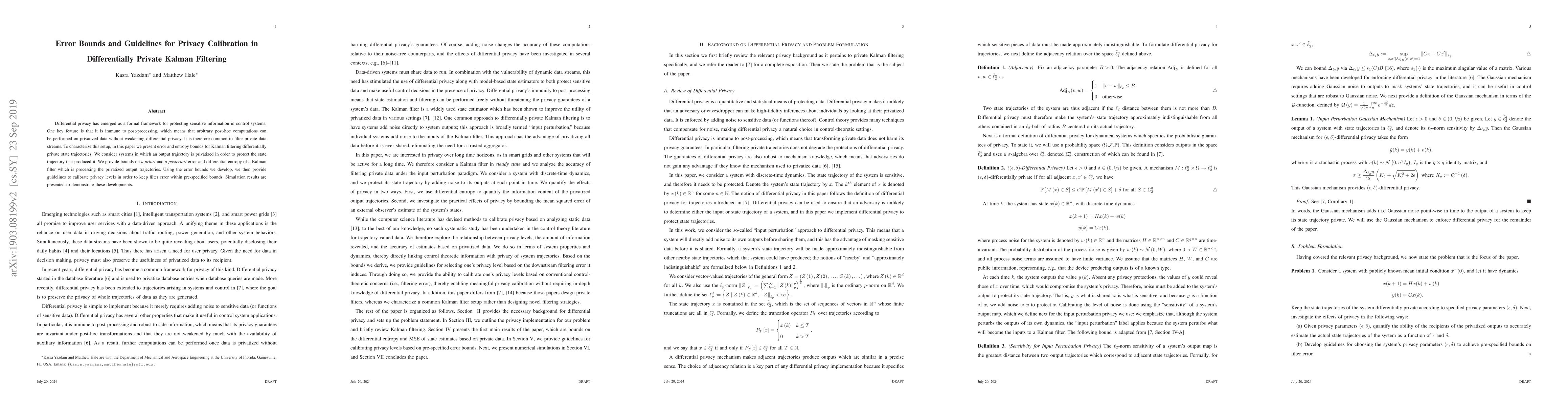 This paper presents error and entropy bounds for differentially private Kalman filtering, focusing on systems where output trajectories are privatized to protect underlying state trajectories. It provides guidelines for calibrating privacy levels to maintain filter error within specified limits, supported by simulation results.