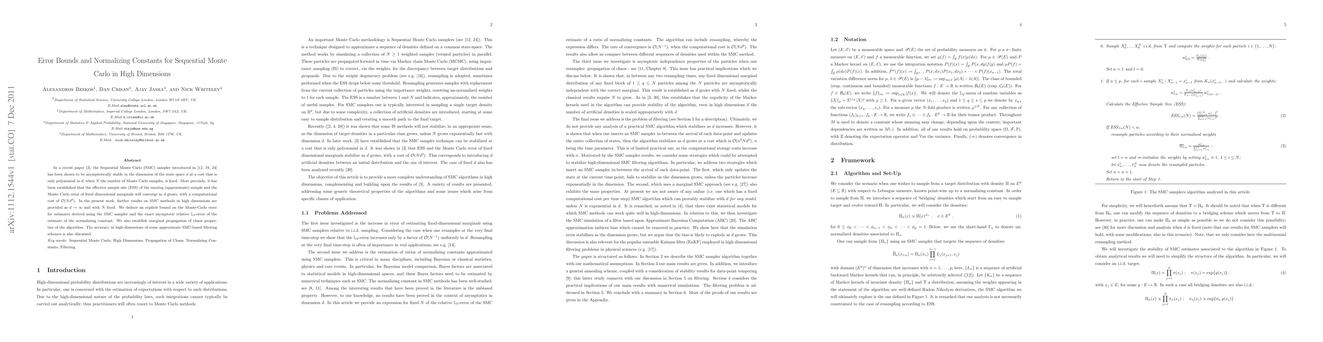 In a recent paper Beskos et al (2011), the Sequential Monte Carlo (SMC) sampler introduced in Del Moral et al (2006), Neal (2001) has been shown to be asymptotically stable in the dimension of the state space d at a cost that is only polynomial in d, when N the number of Monte Carlo samples, is fixed. More precisely, it has been established that the effective sample size (ESS) of the ensuing (approximate) sample and the Monte Carlo error of fixed dimensional marginals will converge as $d$ grows, with a computational cost of $\mathcal{O}(Nd^2)$. In the present work, further results on SMC methods in high dimensions are provided as $d\to\infty$ and with $N$ fixed. We deduce an explicit bound on the Monte-Carlo error for estimates derived using the SMC sampler and the exact asymptotic relative $\mathbb{L}_2$-error of the estimate of the normalizing constant. We also establish marginal propagation of chaos properties of the algorithm. The accuracy in high-dimensions of some approximate SMC-based filtering schemes is also discussed.