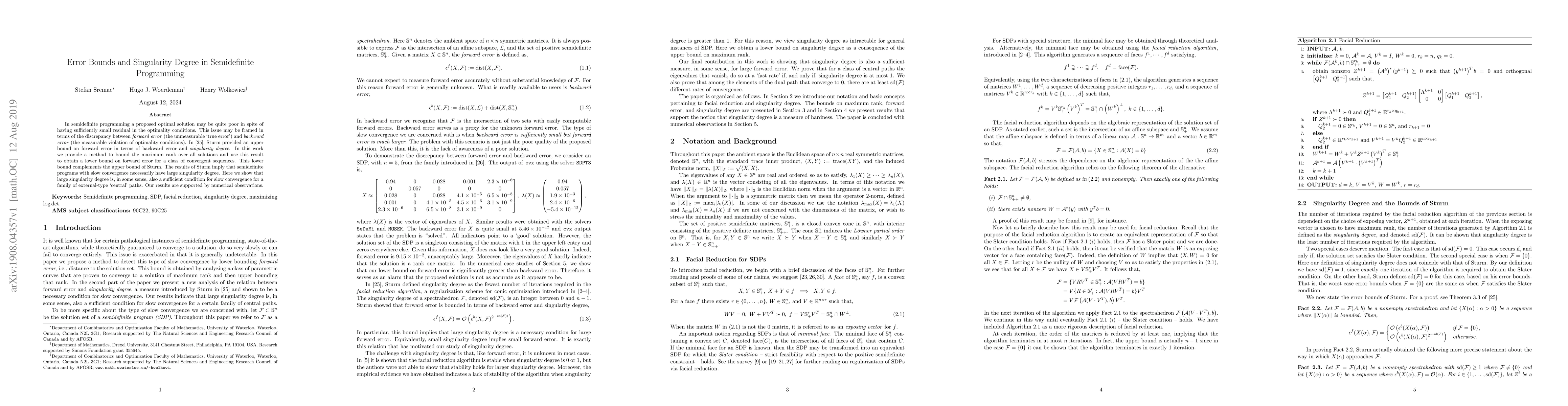 In semidefinite programming a proposed optimal solution may be quite poor in spite of having sufficiently small residual in the optimality conditions. This issue may be framed in terms of the discrepancy between forward error (the unmeasurable `true error') and backward error (the measurable violation of optimality conditions). In his seminal work, Sturm provided an upper bound on forward error in terms of backward error and singularity degree. In this paper we provide a method to bound the maximum rank over all solutions and use this result to obtain a lower bound on forward error for a class of convergent sequences. This lower bound complements the upper bound of Sturm. The results of Sturm imply that semidefinite programs with slow convergence necessarily have large singularity degree. Here we show that large singularity degree is, in some sense, also a sufficient condition for slow convergence for a family of external-type `central' paths. Our results are supported by numerical observations.