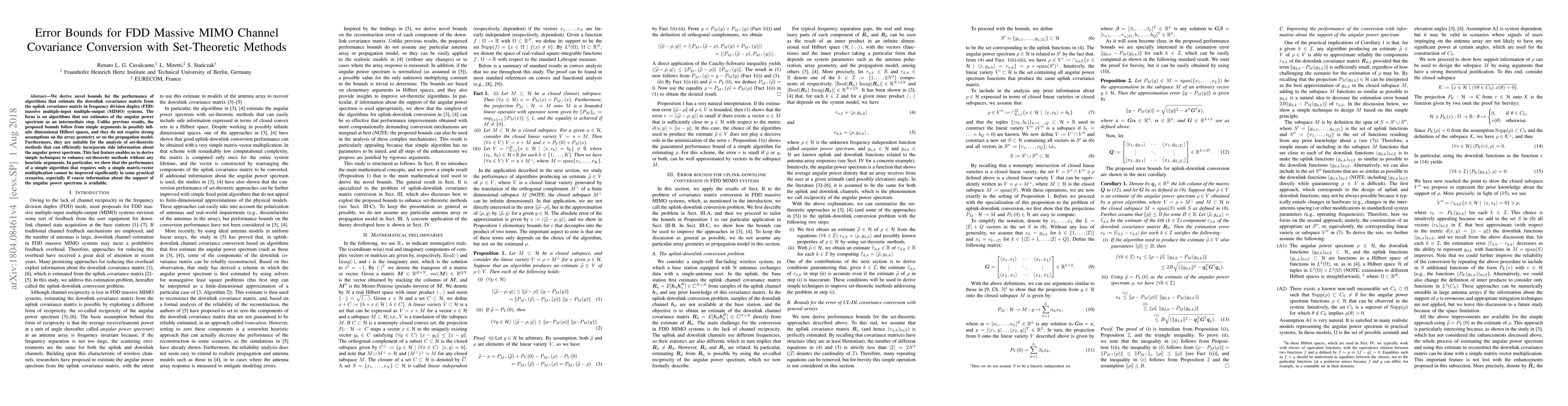 We derive novel bounds for the performance of algorithms that estimate the downlink covariance matrix from the uplink covariance matrix in frequency division duplex (FDD) massive multiple-input multiple-output (MIMO) systems. The focus is on algorithms that use estimates of the angular power spectrum as an intermediate step. Unlike previous results, the proposed bounds follow from simple arguments in possibly infinite dimensional Hilbert spaces, and they do not require strong assumptions on the array geometry or on the propagation model. Furthermore, they are suitable for the analysis of set-theoretic methods that can efficiently incorporate side information about the angular power spectrum. This last feature enables us to derive simple techniques to enhance set-theoretic methods without any heuristic arguments. In particular, we show that the performance of a simple algorithm that requires only a simple matrix-vector multiplication cannot be improved significantly in some practical scenarios, especially if coarse information about the support of the angular power spectrum is available.
