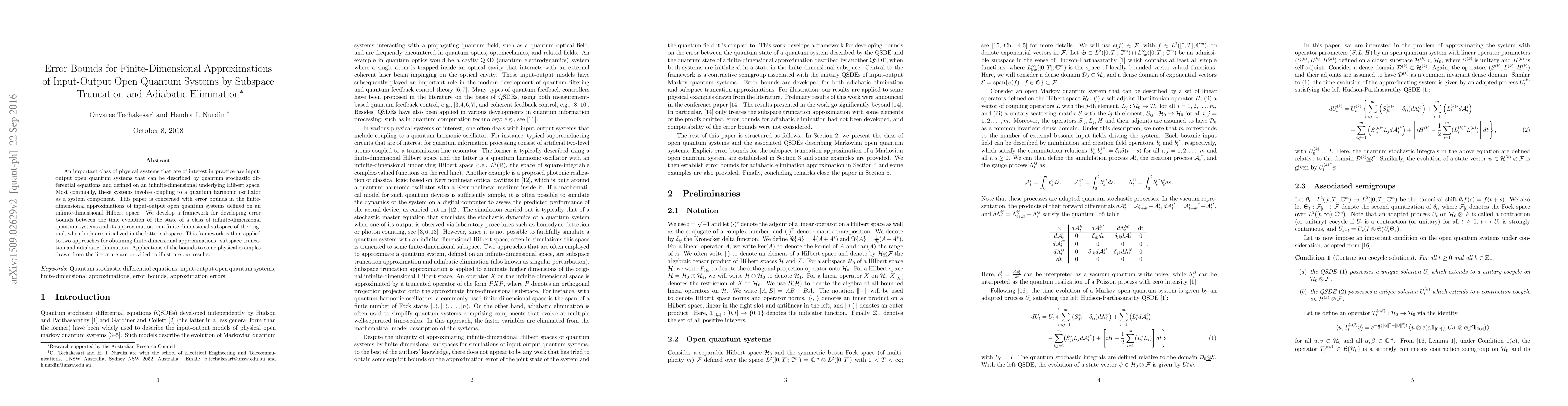 This paper develops error bounds for finite-dimensional approximations of input-output open quantum systems via subspace truncation and adiabatic elimination. It provides a framework to quantify the error between the infinite-dimensional system's evolution and its finite-dimensional approximation, applied to physical examples.