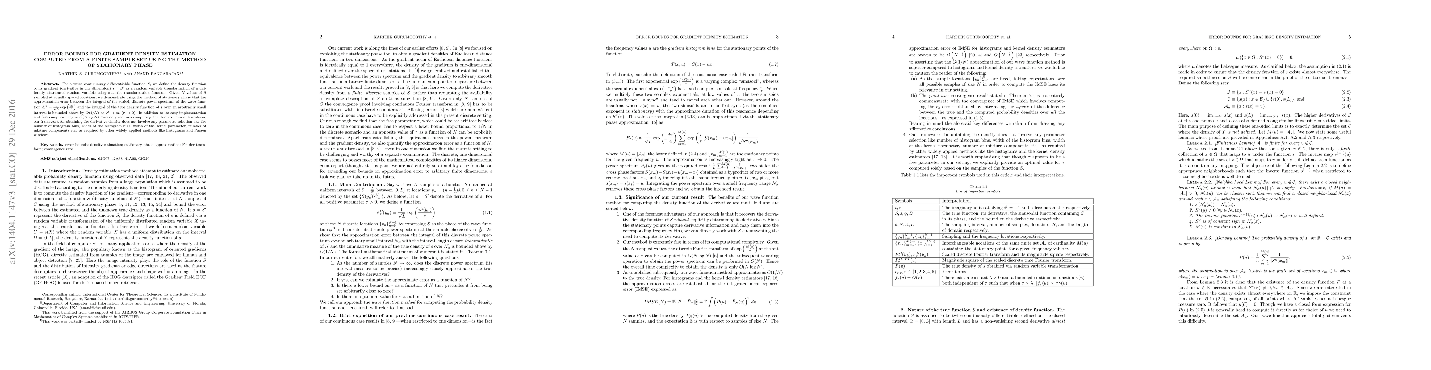 This paper establishes error bounds for gradient density estimation using the method of stationary phase, showing that the approximation error is $O(1/N)$ as the sample size $N$ increases. The proposed method is computationally efficient and does not require parameter selection, unlike traditional methods like histograms and Parzen windows.