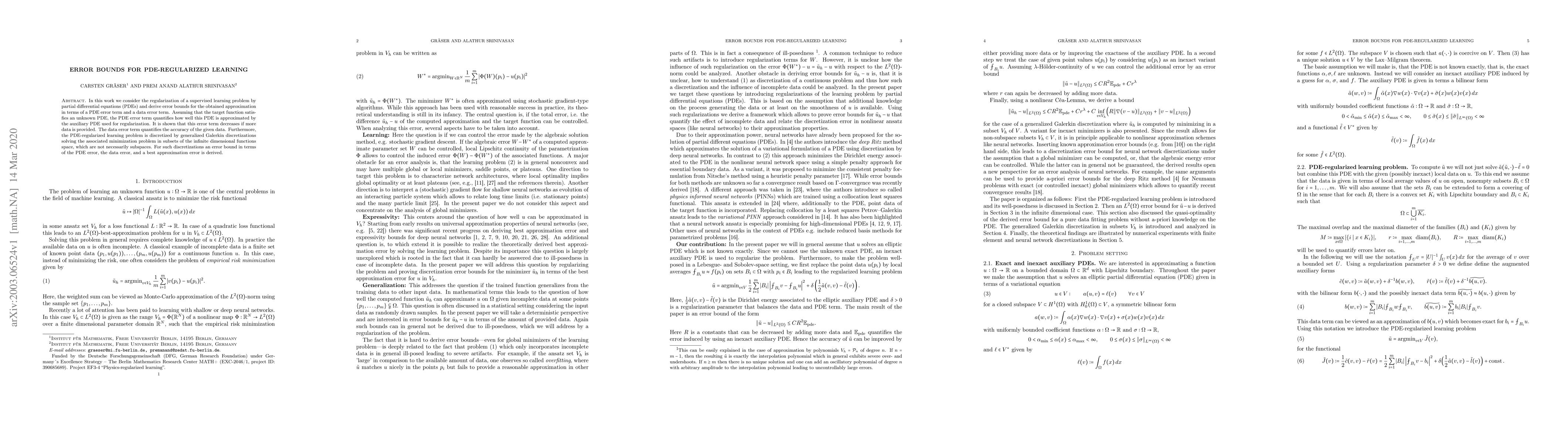 This paper derives error bounds for PDE-regularized learning, combining a PDE error term and a data error term. It shows that the PDE error decreases with more data, and provides a discretization error bound for generalized Galerkin methods in non-traditional function spaces.