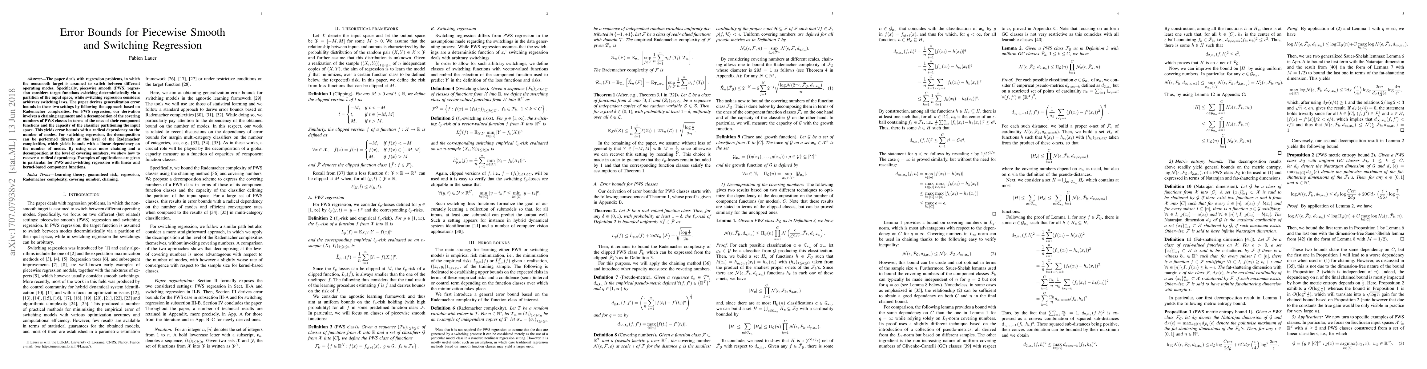 The paper deals with regression problems, in which the nonsmooth target is assumed to switch between different operating modes. Specifically, piecewise smooth (PWS) regression considers target functions switching deterministically via a partition of the input space, while switching regression considers arbitrary switching laws. The paper derives generalization error bounds in these two settings by following the approach based on Rademacher complexities. For PWS regression, our derivation involves a chaining argument and a decomposition of the covering numbers of PWS classes in terms of the ones of their component functions and the capacity of the classifier partitioning the input space. This yields error bounds with a radical dependency on the number of modes. For switching regression, the decomposition can be performed directly at the level of the Rademacher complexities, which yields bounds with a linear dependency on the number of modes. By using once more chaining and a decomposition at the level of covering numbers, we show how to recover a radical dependency. Examples of applications are given in particular for PWS and swichting regression with linear and kernel-based component functions.
