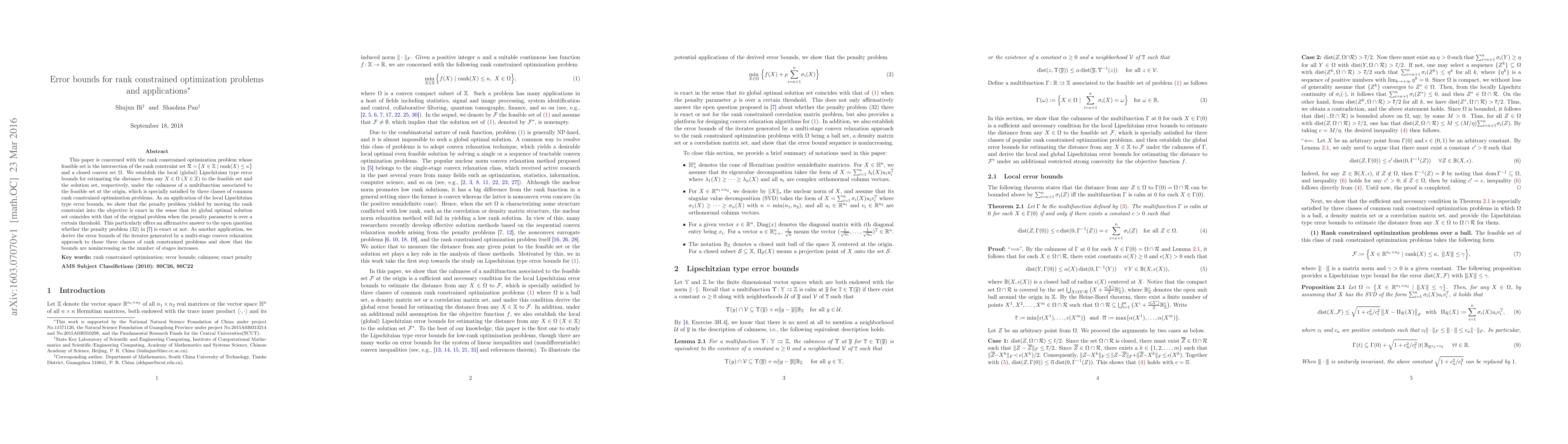 This paper establishes local and global Lipschitzian type error bounds for rank constrained optimization problems, proving exactness of a penalty method and deriving nonincreasing error bounds for multi-stage convex relaxation approaches.
