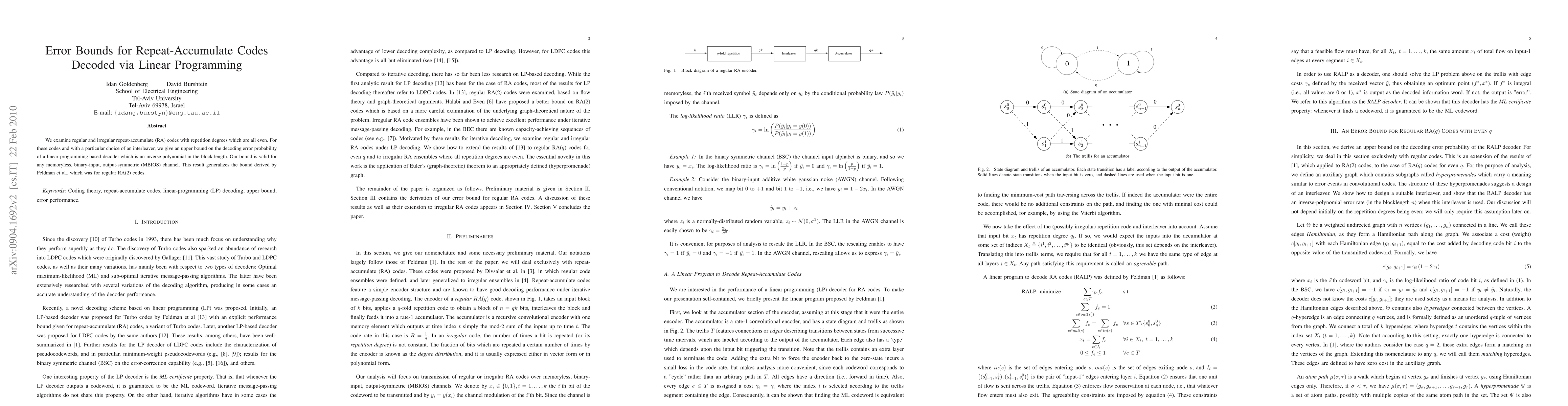 We examine regular and irregular repeat-accumulate (RA) codes with repetition degrees which are all even. For these codes and with a particular choice of an interleaver, we give an upper bound on the decoding error probability of a linear-programming based decoder which is an inverse polynomial in the block length. Our bound is valid for any memoryless, binary-input, output-symmetric (MBIOS) channel. This result generalizes the bound derived by Feldman et al., which was for regular RA(2) codes.