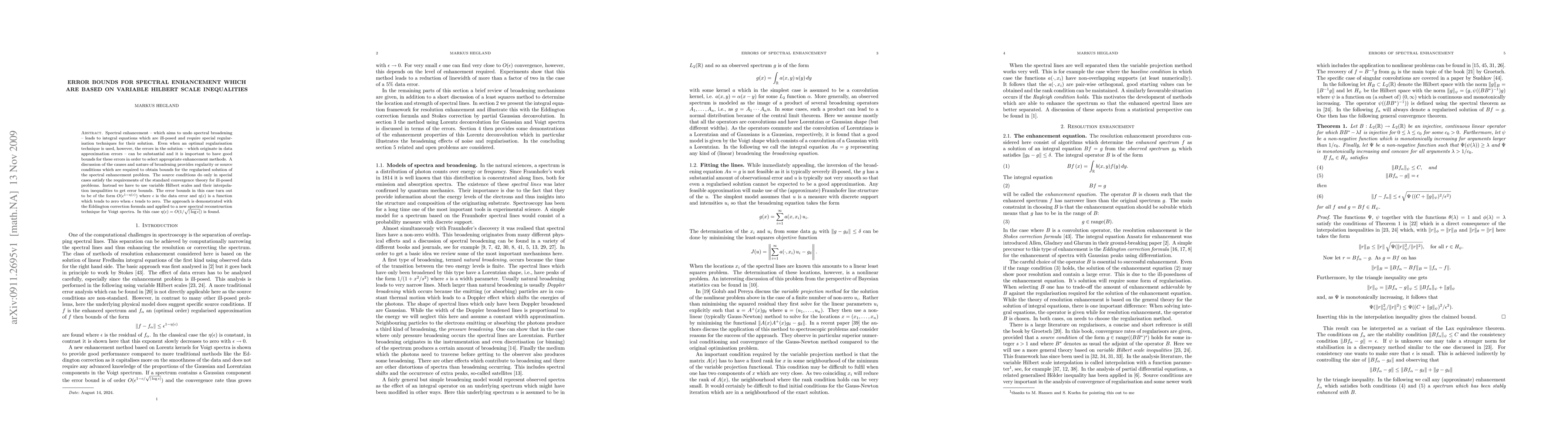 Spectral enhancement -- which aims to undo spectral broadening -- leads to integral equations which are ill-posed and require special regularisation techniques for their solution. Even when an optimal regularisation technique is used, however, the errors in the solution -- which originate in data approximation errors -- can be substantial and it is important to have good bounds for these errors in order to select appropriate enhancement methods. A discussion of the causes and nature of broadening provides regularity or source conditions which are required to obtain bounds for the regularised solution of the spectral enhancement problem. The source conditions do only in special cases satisfy the requirements of the standard convergence theory for ill-posed problems. Instead we have to use variable Hilbert scales and their interpolation inequalities to get error bounds. The error bounds in this case turn out to be of the form $O(\epsilon^{1-\eta(\epsilon)})$ where $\epsilon$ is the data error and $\eta(\epsilon)$ is a function which tends to zero when $\epsilon$ tends to zero. The approach is demonstrated with the Eddington correction formula and applied to a new spectral reconstruction technique for Voigt spectra. In this case $\eta(\epsilon)=O(1/\sqrt{|\log\epsilon|})$ is found.