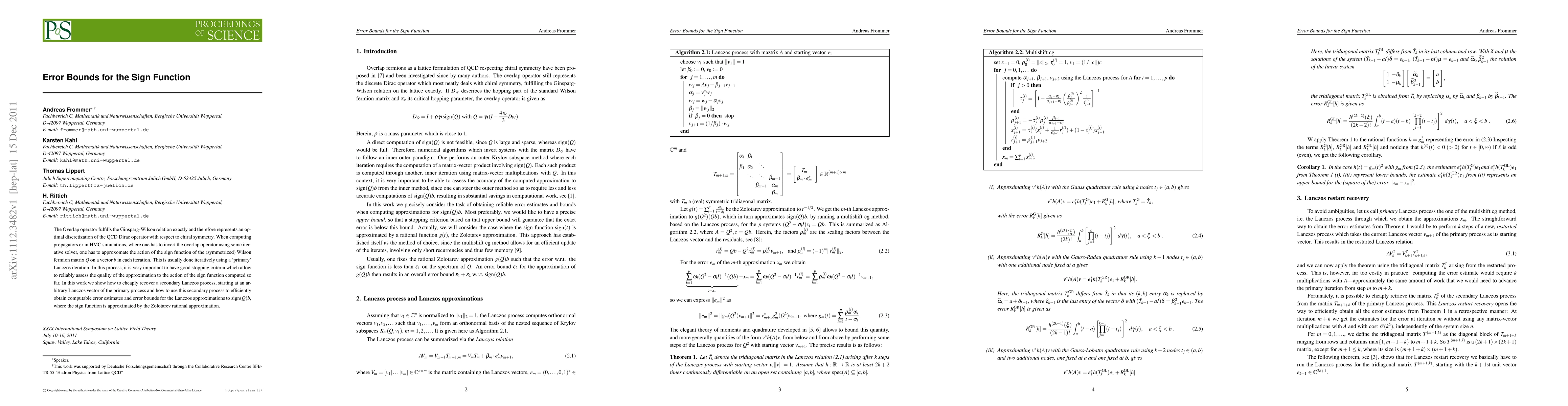 The Overlap operator fulfills the Ginsparg-Wilson relation exactly and therefore represents an optimal discretization of the QCD Dirac operator with respect to chiral symmetry. When computing propagators or in HMC simulations, where one has to invert the overlap operator using some iterative solver, one has to approxomate the action of the sign function of the (symmetrized) Wilson fermion matrix Q on a vector b in each iteration. This is usually done iteratively using a "primary" Lanczos iteration. In this process, it is very important to have good stopping criteria which allow to reliably assess the quality of the approximation to the action of the sign function computed so far. In this work we show how to cheaply recover a secondary Lanczos process, starting at an arbitrary Lanczos vector of the primary process and how to use this secondary process to efficiently obtain computable error estimates and error bounds for the Lanczos approximations to sign(Q)b, where the sign function is approximated by the Zolotarev rational approximation.