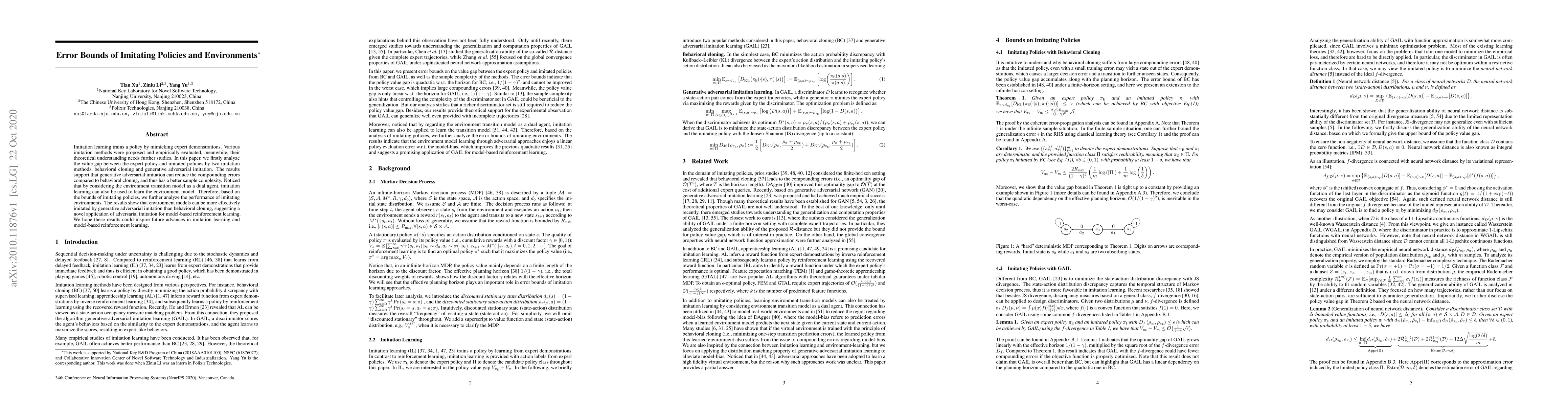 Imitation learning trains a policy by mimicking expert demonstrations. Various imitation methods were proposed and empirically evaluated, meanwhile, their theoretical understanding needs further studies. In this paper, we firstly analyze the value gap between the expert policy and imitated policies by two imitation methods, behavioral cloning and generative adversarial imitation. The results support that generative adversarial imitation can reduce the compounding errors compared to behavioral cloning, and thus has a better sample complexity. Noticed that by considering the environment transition model as a dual agent, imitation learning can also be used to learn the environment model. Therefore, based on the bounds of imitating policies, we further analyze the performance of imitating environments. The results show that environment models can be more effectively imitated by generative adversarial imitation than behavioral cloning, suggesting a novel application of adversarial imitation for model-based reinforcement learning. We hope these results could inspire future advances in imitation learning and model-based reinforcement learning.