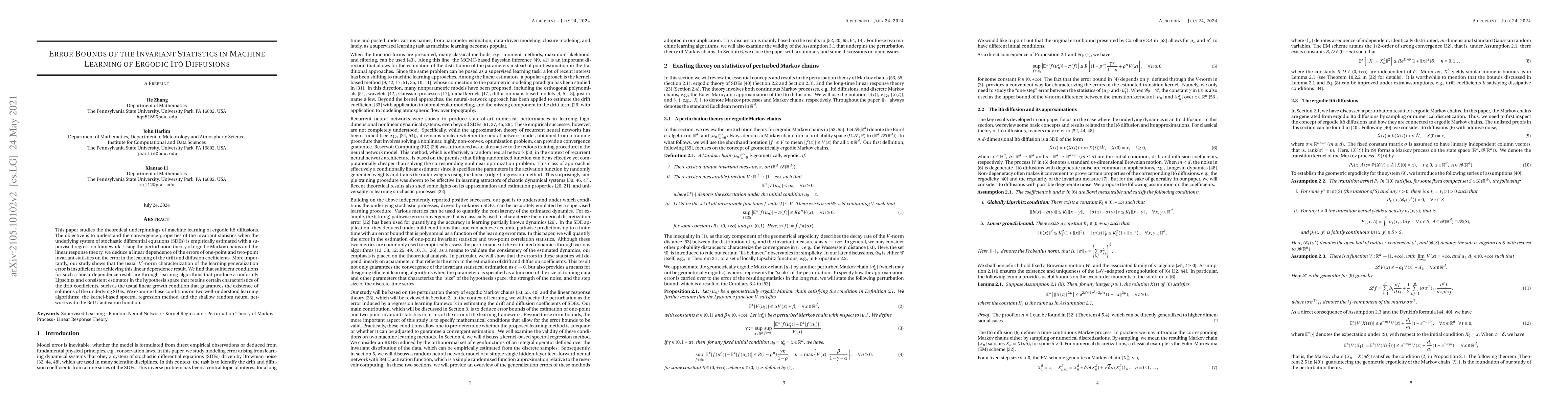 This paper studies the theoretical underpinnings of machine learning of ergodic It\^o diffusions. The objective is to understand the convergence properties of the invariant statistics when the underlying system of stochastic differential equations (SDEs) is empirically estimated with a supervised regression framework. Using the perturbation theory of ergodic Markov chains and the linear response theory, we deduce a linear dependence of the errors of one-point and two-point invariant statistics on the error in the learning of the drift and diffusion coefficients. More importantly, our study shows that the usual $L^2$-norm characterization of the learning generalization error is insufficient for achieving this linear dependence result. We find that sufficient conditions for such a linear dependence result are through learning algorithms that produce a uniformly Lipschitz and consistent estimator in the hypothesis space that retains certain characteristics of the drift coefficients, such as the usual linear growth condition that guarantees the existence of solutions of the underlying SDEs. We examine these conditions on two well-understood learning algorithms: the kernel-based spectral regression method and the shallow random neural networks with the ReLU activation function.