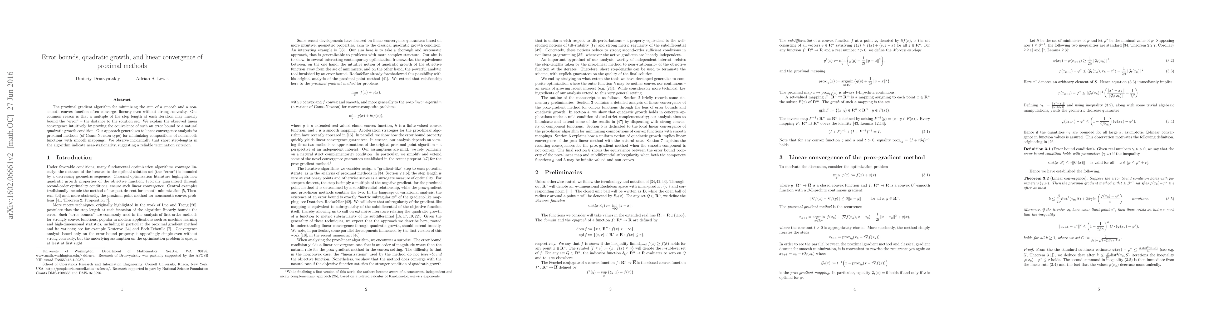 The proximal gradient algorithm for minimizing the sum of a smooth and a nonsmooth convex function often converges linearly even without strong convexity. One common reason is that a multiple of the step length at each iteration may linearly bound the "error" -- the distance to the solution set. We explain the observed linear convergence intuitively by proving the equivalence of such an error bound to a natural quadratic growth condition. Our approach generalizes to linear convergence analysis for proximal methods (of Gauss-Newton type) for minimizing compositions of nonsmooth functions with smooth mappings. We observe incidentally that short step-lengths in the algorithm indicate near-stationarity, suggesting a reliable termination criterion.