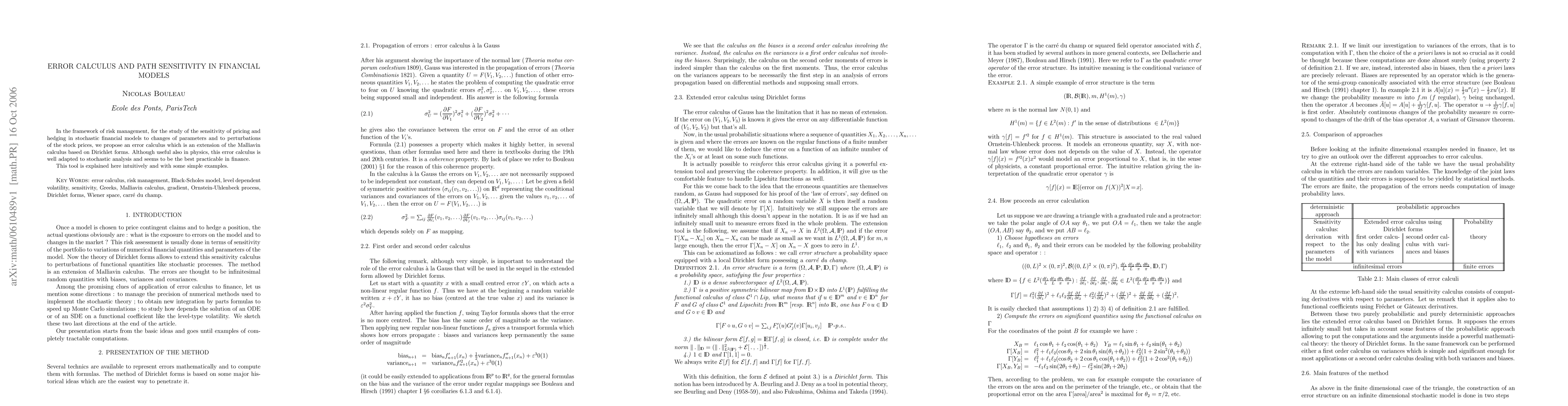 In the framework of risk management, for the study of the sensitivity of pricing and hedging in stochastic financial models to changes of parameters and to perturbations of the stock prices, we propose an error calculus which is an extension of the Malliavin calculus based on Dirichlet forms. Although useful also in physics, this error calculus is well adapted to stochastic analysis and seems to be the best practicable in finance. This tool is explained here intuitively and with some simple examples.