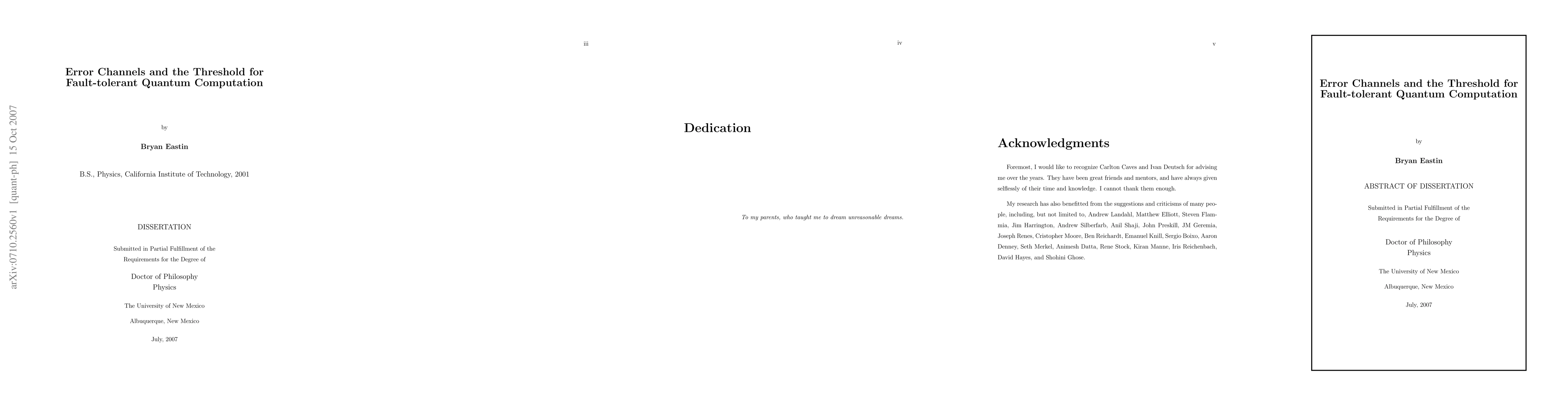 This dissertation treats the topics of threshold calculation, ancilla construction, and non-standard error models. Chapter 2 introduces background material ranging from quantum mechanics to classical coding to thresholds for quantum computation. In Chapter 3 numerical and analytical means are used to generate estimates of and bounds on the threshold given an error model described by a restricted stochastic Pauli channel. Chapter 4 develops a simple, flexible means of estimating the threshold and applies it to some cases of interest. Finally, a novel method of ancilla construction is proposed in Chapter 5, and the difficulties associated with implementing it are discussed.