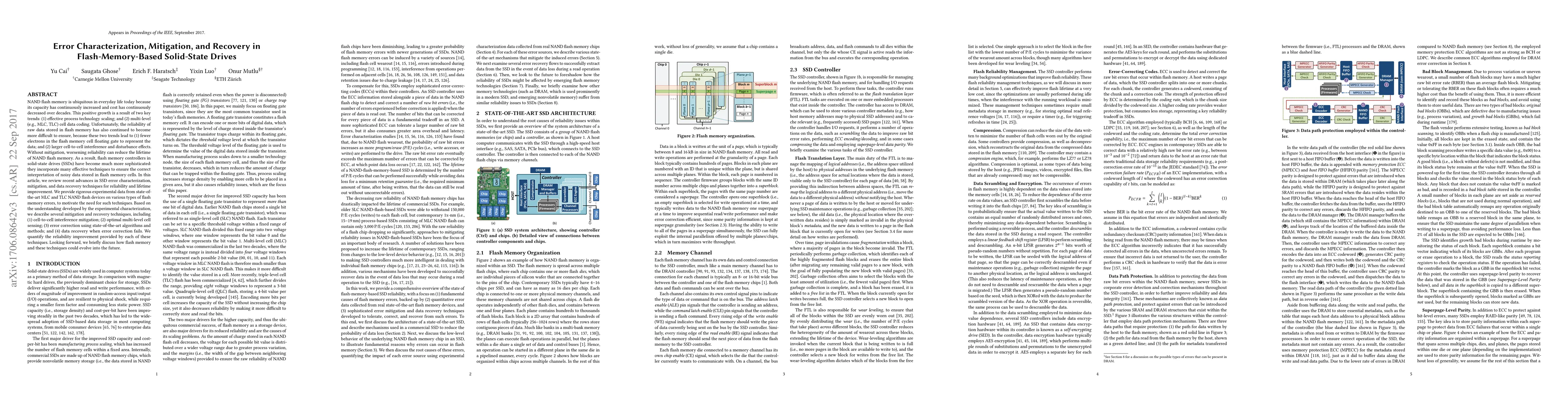 This paper reviews recent advances in error characterization, mitigation, and recovery techniques for improving the reliability and lifetime of NAND flash memory in SSDs. It provides rigorous experimental data on various flash memory errors and describes techniques like interference mitigation, optimal multi-level cell sensing, error correction algorithms, and data recovery methods, quantifying their reliability improvements.