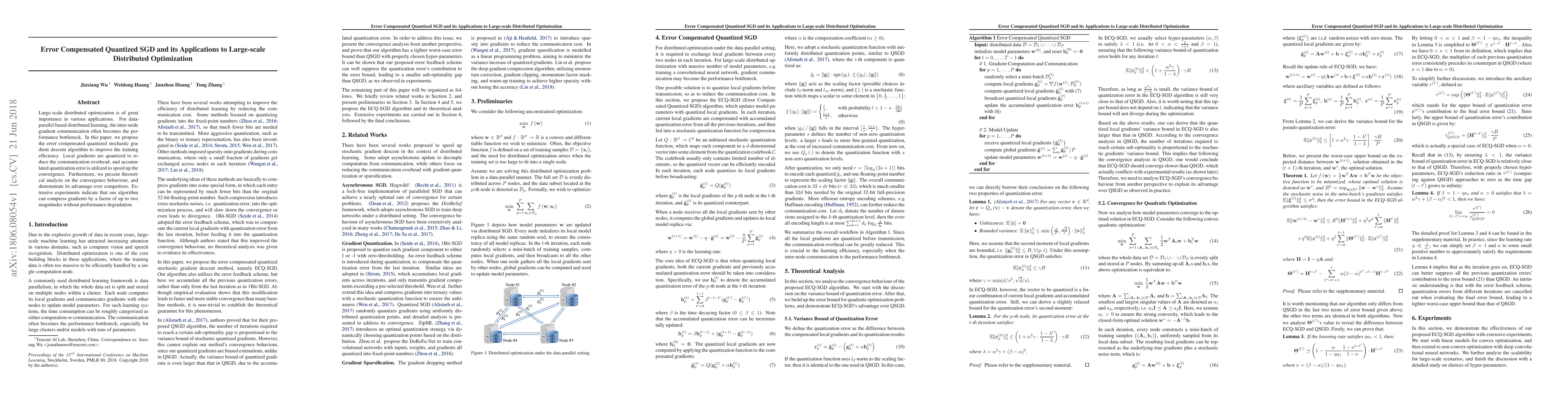 This paper proposes an error compensated quantized stochastic gradient descent algorithm to enhance training efficiency in large-scale distributed optimization. The algorithm quantizes local gradients to reduce communication overhead while leveraging accumulated quantization error to accelerate convergence, demonstrating significant performance improvements over existing methods.