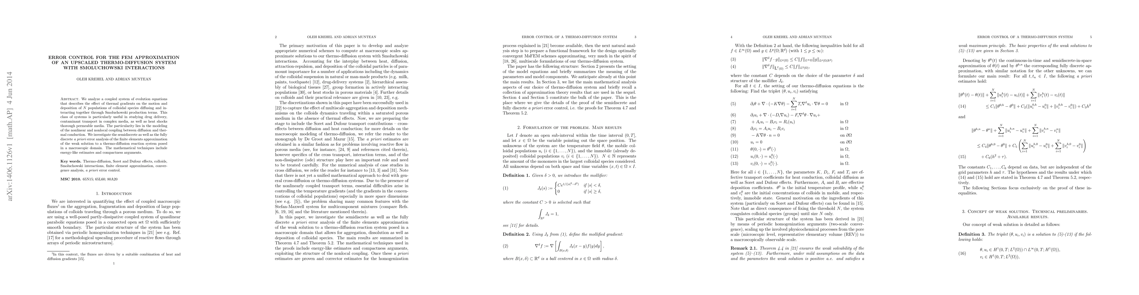 This paper analyzes the finite element method (FEM) for approximating a coupled thermo-diffusion system with Smoluchowski interactions, focusing on error control. It employs energy-like estimates and compactness arguments to conduct an a priori error analysis for both semidiscrete and fully discrete schemes.