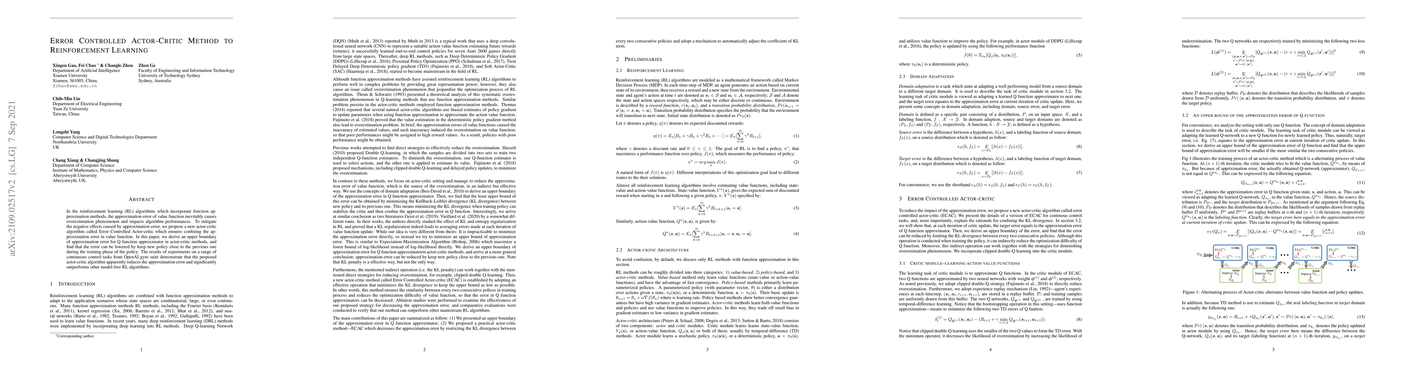 The paper proposes an Error Controlled Actor-Critic method to mitigate overestimation caused by value function approximation errors, ensuring a confined approximation error. Experimental results show that this approach significantly reduces approximation error and outperforms other model-free reinforcement learning algorithms in continuous control tasks.