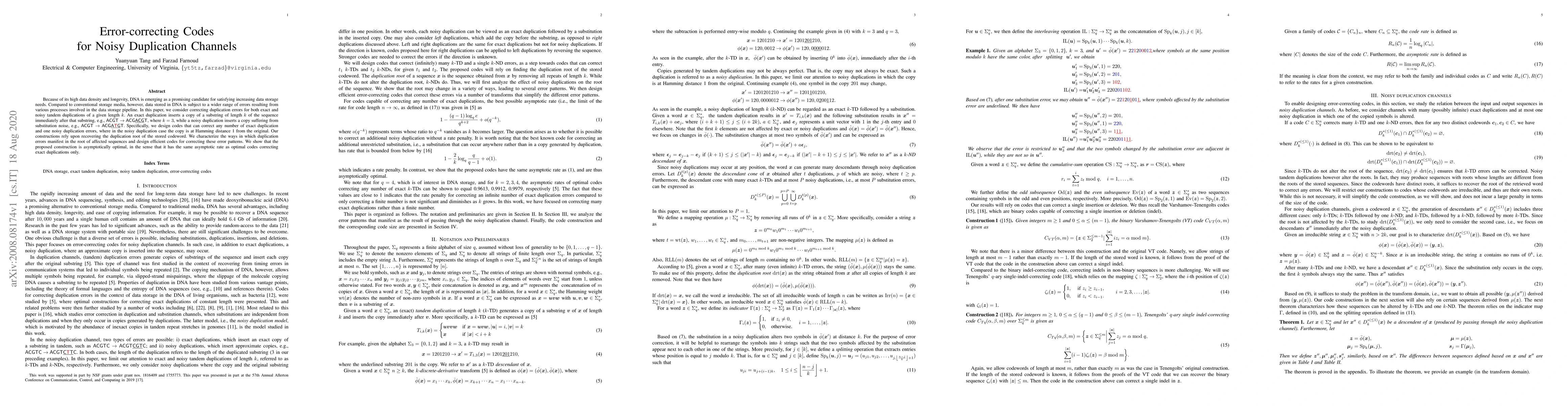 This paper proposes error-correcting codes for DNA storage, focusing on correcting exact and noisy duplication errors. The designed codes can correct multiple exact duplications and one noisy duplication, where the noisy copy is at Hamming distance 1 from the original. The constructions are shown to be asymptotically optimal.