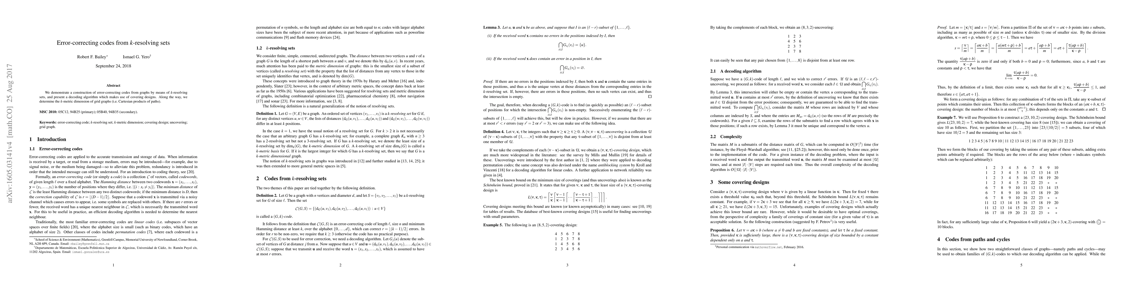 We demonstrate a construction of error-correcting codes from graphs by means of $k$-resolving sets, and present a decoding algorithm which makes use of covering designs. Along the way, we determine the $k$-metric dimension of grid graphs (i.e. Cartesian products of paths).