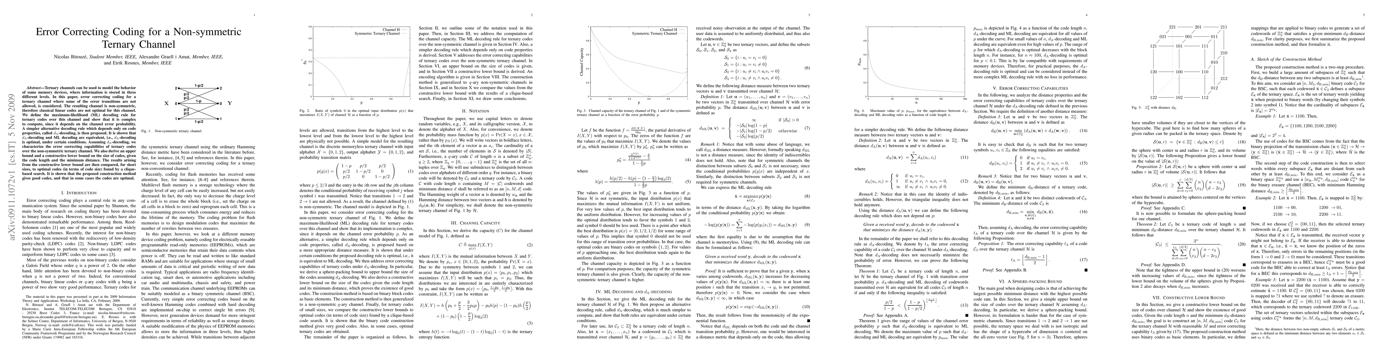 Ternary channels can be used to model the behavior of some memory devices, where information is stored in three different levels. In this paper, error correcting coding for a ternary channel where some of the error transitions are not allowed, is considered. The resulting channel is non-symmetric, therefore classical linear codes are not optimal for this channel. We define the maximum-likelihood (ML) decoding rule for ternary codes over this channel and show that it is complex to compute, since it depends on the channel error probability. A simpler alternative decoding rule which depends only on code properties, called $\da$-decoding, is then proposed. It is shown that $\da$-decoding and ML decoding are equivalent, i.e., $\da$-decoding is optimal, under certain conditions. Assuming $\da$-decoding, we characterize the error correcting capabilities of ternary codes over the non-symmetric ternary channel. We also derive an upper bound and a constructive lower bound on the size of codes, given the code length and the minimum distance. The results arising from the constructive lower bound are then compared, for short sizes, to optimal codes (in terms of code size) found by a clique-based search. It is shown that the proposed construction method gives good codes, and that in some cases the codes are optimal.