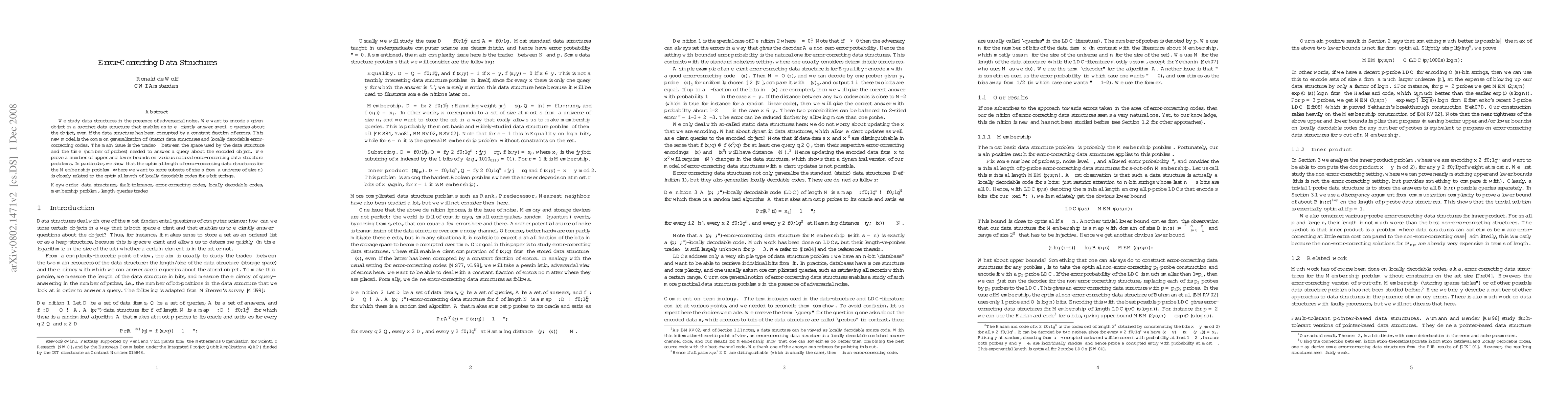 We study data structures in the presence of adversarial noise. We want to encode a given object in a succinct data structure that enables us to efficiently answer specific queries about the object, even if the data structure has been corrupted by a constant fraction of errors. This new model is the common generalization of (static) data structures and locally decodable error-correcting codes. The main issue is the tradeoff between the space used by the data structure and the time (number of probes) needed to answer a query about the encoded object. We prove a number of upper and lower bounds on various natural error-correcting data structure problems. In particular, we show that the optimal length of error-correcting data structures for the Membership problem (where we want to store subsets of size s from a universe of size n) is closely related to the optimal length of locally decodable codes for s-bit strings.