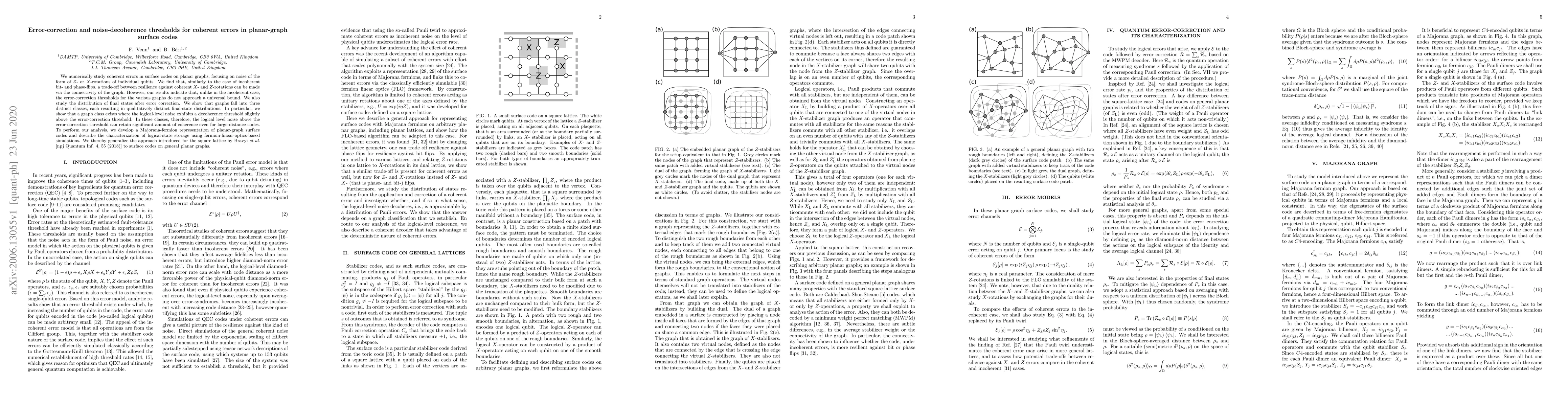 We numerically study coherent errors in surface codes on planar graphs, focusing on noise of the form of $Z$- or $X$-rotations of individual qubits. We find that, similarly to the case of incoherent bit- and phase-flips, a trade-off between resilience against coherent $X$- and $Z$-rotations can be made via the connectivity of the graph. However, our results indicate that, unlike in the incoherent case, the error-correction thresholds for the various graphs do not approach a universal bound. We also study the distribution of final states after error correction. We show that graphs fall into three distinct classes, each resulting in qualitatively distinct final-state distributions. In particular, we show that a graph class exists where the logical-level noise exhibits a decoherence threshold slightly above the error-correction threshold. In these classes, therefore, the logical level noise above the error-correction threshold can retain significant amount of coherence even for large-distance codes. To perform our analysis, we develop a Majorana-fermion representation of planar-graph surface codes and describe the characterization of logical-state storage using fermion-linear-optics-based simulations. We thereby generalize the approach introduced for the square lattice by Bravyi \textit{et al}. [npj Quantum Inf. 4, 55 (2018)] to surface codes on general planar graphs.