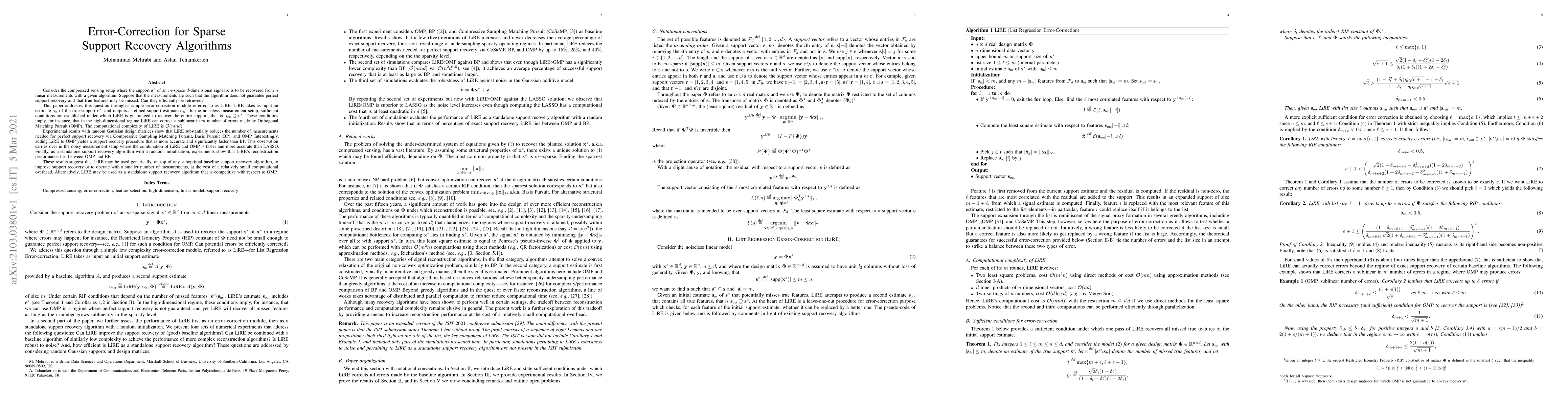 This paper introduces LiRE, an error-correction module for sparse support recovery algorithms, which refines initial estimates to recover the entire support of a sparse signal. LiRE is shown to correct errors made by algorithms like OMP and reduce the number of measurements needed for perfect recovery, while maintaining computational efficiency and outperforming BP in accuracy and speed.