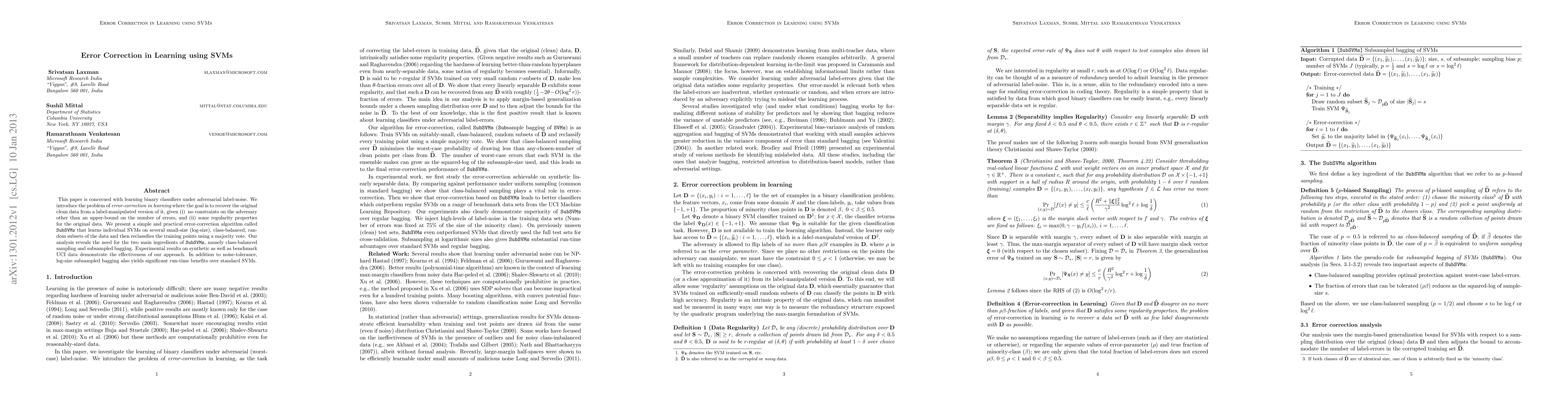 Researchers developed SubSVMs, an error-correction algorithm that uses subsampled bagging to learn binary classifiers under label-noise, achieving noise-tolerance and significant run-time benefits.
