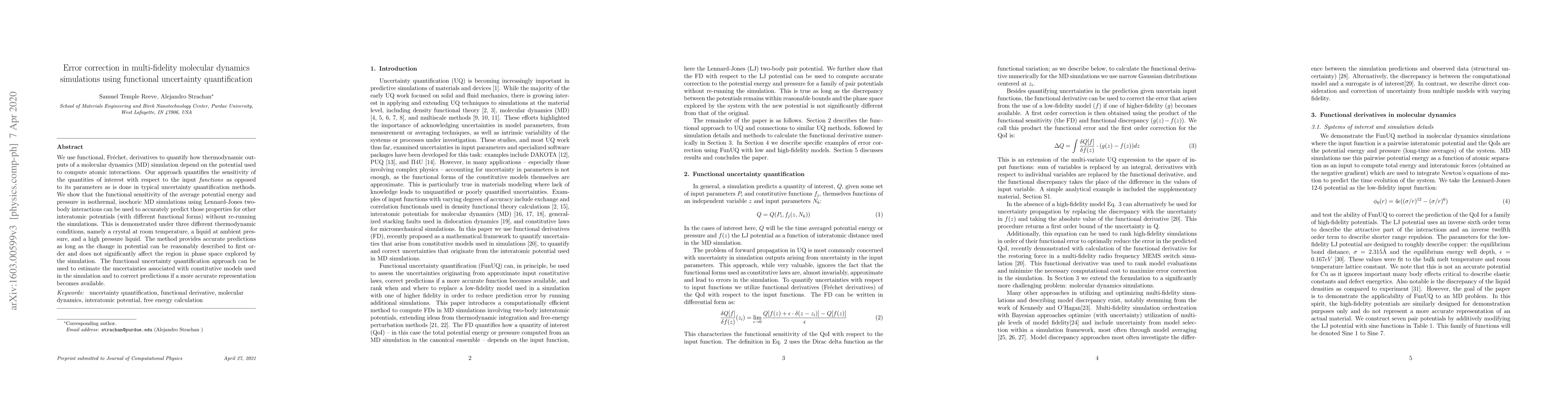 We use functional, Fr\'echet, derivatives to quantify how thermodynamic outputs of a molecular dynamics (MD) simulation depend on the potential used to compute atomic interactions. Our approach quantifies the sensitivity of the quantities of interest with respect to the input functions as opposed to its parameters as is done in typical uncertainty quantification methods. We show that the functional sensitivity of the average potential energy and pressure in isothermal, isochoric MD simulations using Lennard-Jones two-body interactions can be used to accurately predict those properties for other interatomic potentials (with different functional forms) without re-running the simulations. This is demonstrated under three different thermodynamic conditions, namely a crystal at room temperature, a liquid at ambient pressure, and a high pressure liquid. The method provides accurate predictions as long as the change in potential can be reasonably described to first order and does not significantly affect the region in phase space explored by the simulation. The functional uncertainty quantification approach can be used to estimate the uncertainties associated with constitutive models used in the simulation and to correct predictions if a more accurate representation becomes available.