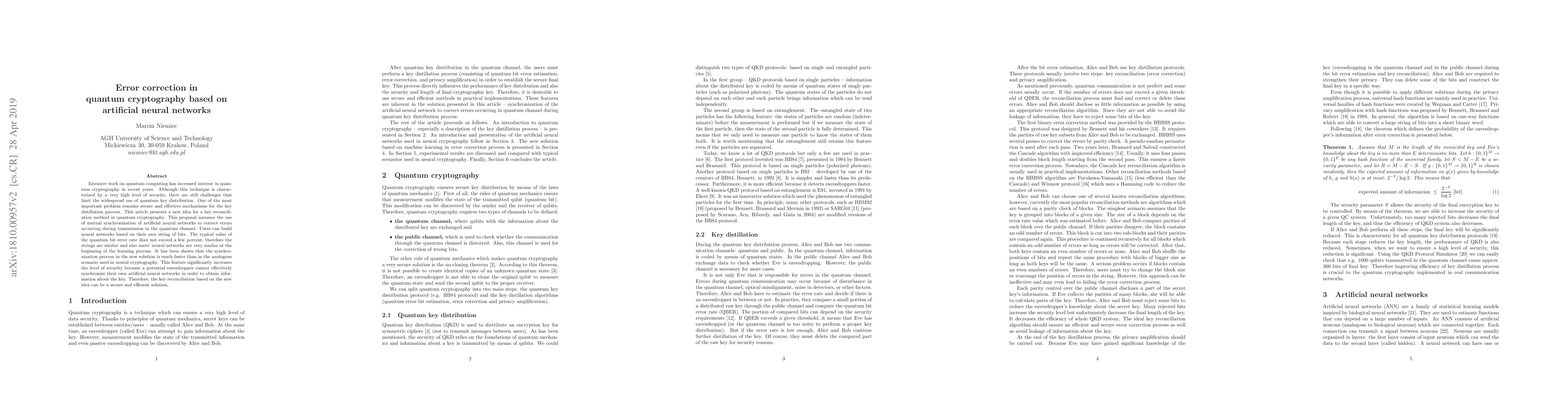 The paper introduces a novel error correction method in quantum cryptography using synchronized ANNs, which offers faster synchronization and improved security compared to existing solutions.