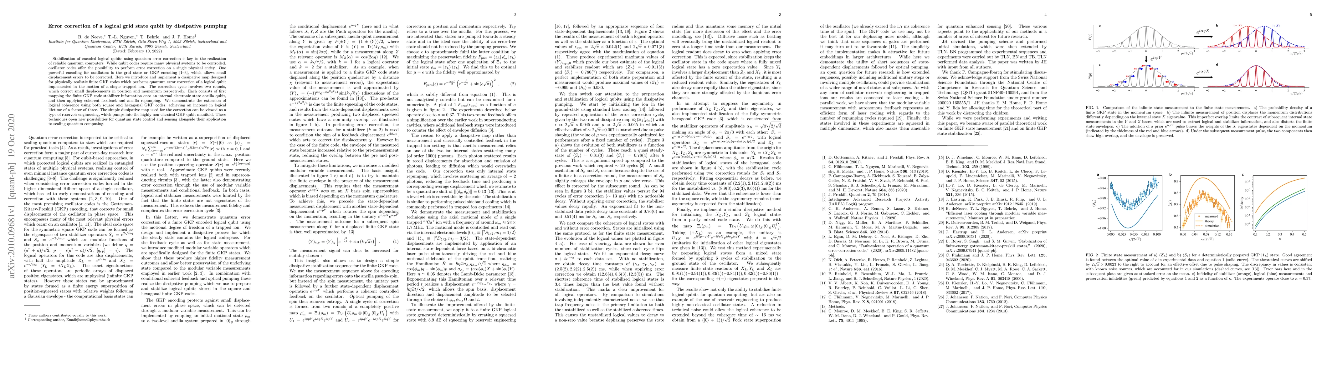 This paper presents a method for quantum error correction of a logical grid state qubit using a dissipative map on a single trapped ion, achieving a threefold increase in logical coherence lifetime. The technique involves mapping stabilizer information onto an ancilla qubit and applying coherent feedback, demonstrating its effectiveness for both square and hexagonal GKP codes.