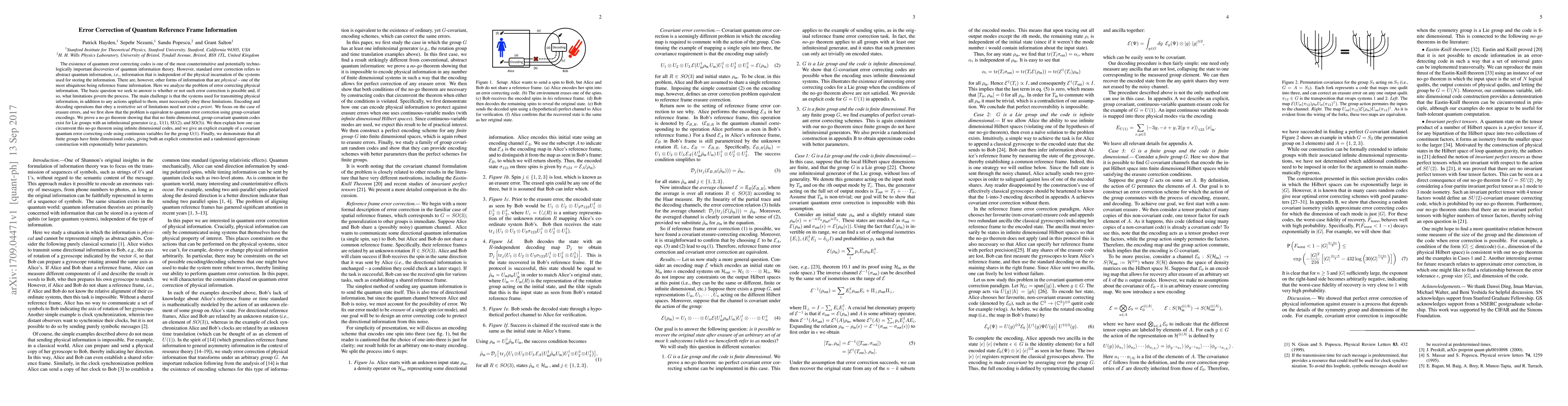 This paper explores the possibility of error correction for quantum reference frame information, demonstrating that no finite-dimensional, group-covariant quantum codes exist for certain Lie groups. However, it proposes a solution using infinite-dimensional codes, providing an example for U(1) and showing finite-dimensional codes exist for finite groups.