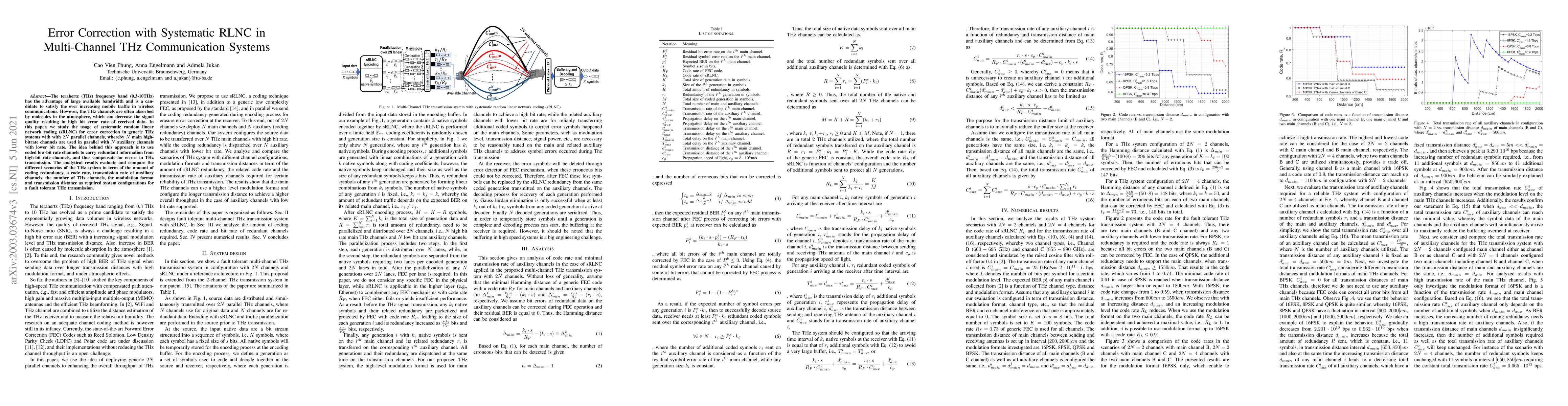 The terahertz (THz) frequency band (0.3-10THz) has the advantage of large available bandwidth and is a candidate to satisfy the ever increasing mobile traffic in wireless communications. However, the THz channels are often absorbed by molecules in the atmosphere, which can decrease the signal quality resulting in high bit error rate of received data. In this paper, we study the usage of systematic random linear network coding (sRLNC) for error correction in generic THz systems with with 2N parallel channels, whereby N main high-bitrate channels are used in parallel with N auxiliary channels with lower bit rate. The idea behind this approach is to use coded low-bit rate channels to carry redundant information from high-bit rate channels, and thus compensate for errors in THz transmission. The analytical results evaluate and compare the different scenarios of the THz system in term of the amount of coding redundancy, a code rate, transmission rate of auxiliary channels, the number of THz channels, the modulation format and transmission distance as required system configurations for a fault tolerant THz transmission.
