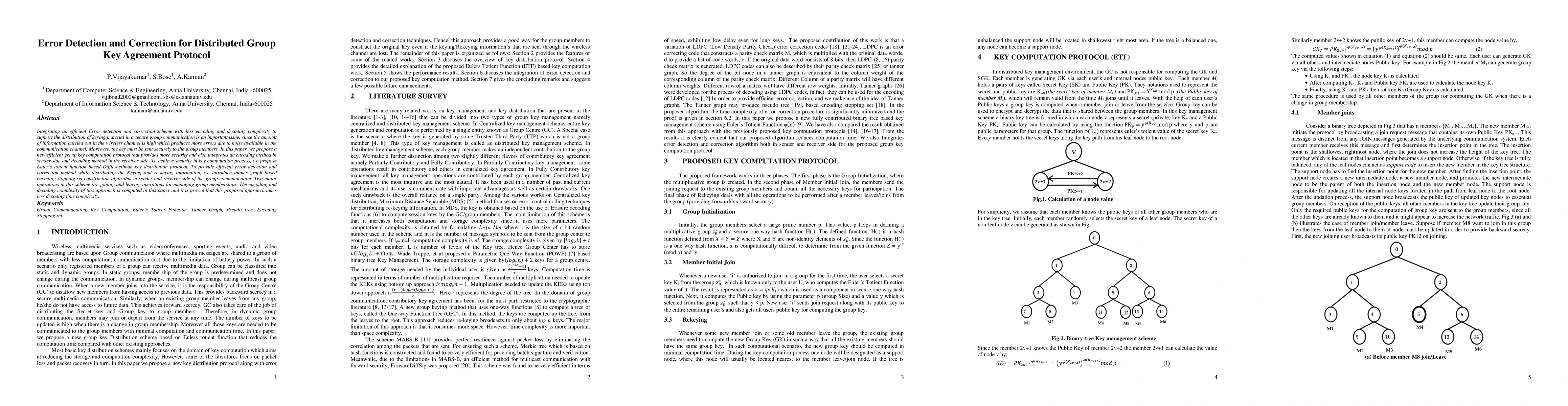 This paper proposes a secure group key agreement protocol with efficient error detection and correction using Euler's totient function and a tanner graph based encoding method. The scheme reduces encoding and decoding complexity, ensuring secure distribution of keying material in wireless communication.