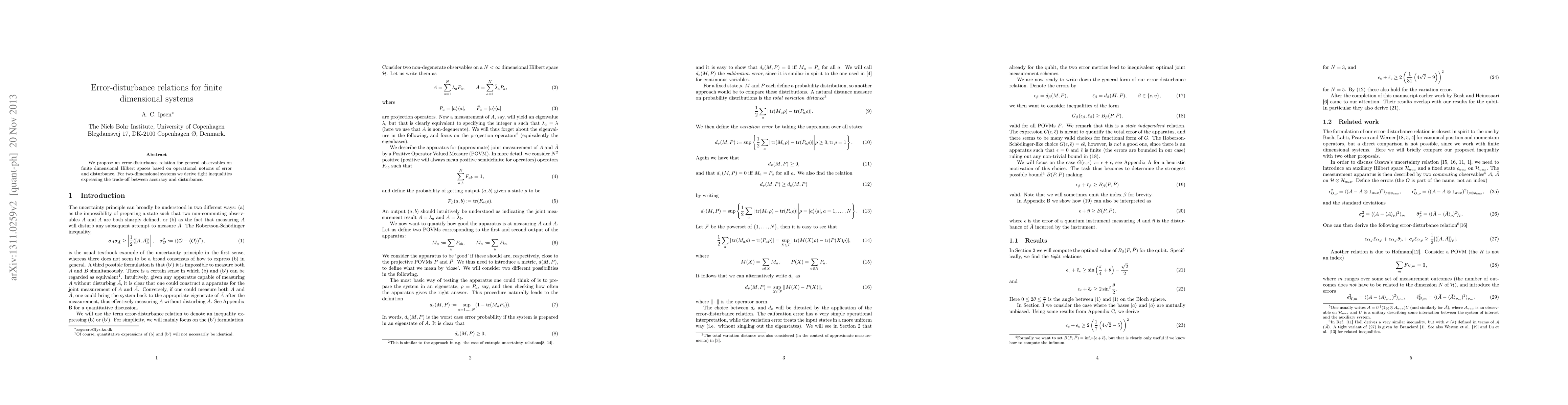 This paper proposes an error-disturbance relation for observables on finite dimensional Hilbert spaces, defining operational notions of error and disturbance. It derives tight inequalities for two-dimensional systems, illustrating the trade-off between accuracy and disturbance.