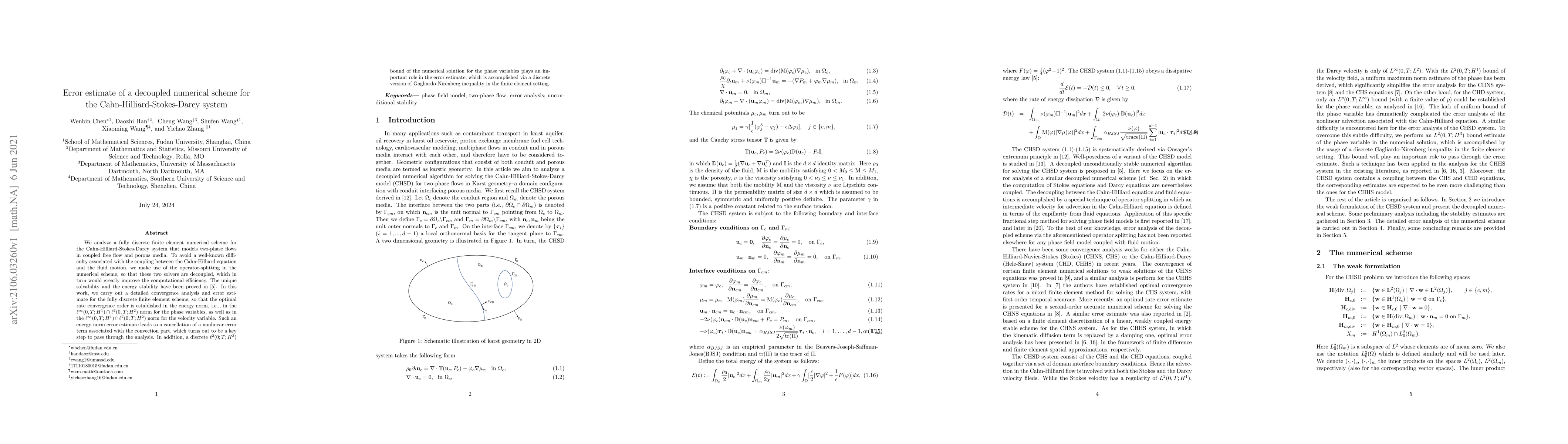 This paper analyzes a fully discrete finite element scheme for the Cahn-Hilliard-Stokes-Darcy system, employing operator-splitting to decouple solvers and improve computational efficiency. The study establishes optimal convergence rates in energy norms and provides an error estimate, including a cancellation of a nonlinear error term and a discrete bound via a Gagliardo-Nirenberg inequality.