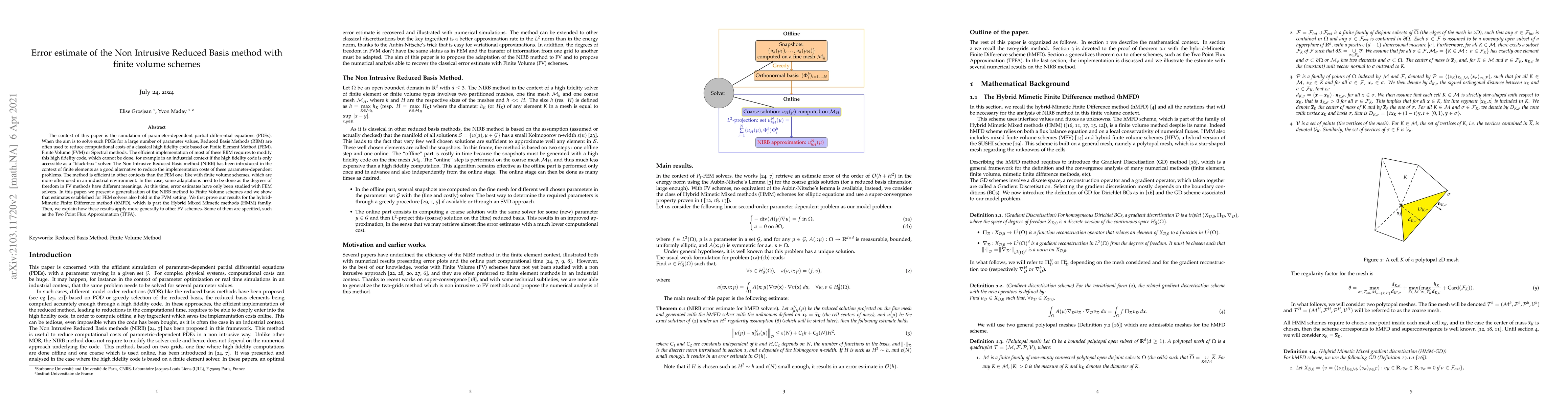 This paper generalizes the Non Intrusive Reduced Basis method (NIRB) to Finite Volume schemes (FVS) for solving parameter-dependent PDEs, demonstrating that error estimates valid for Finite Element Methods (FEM) also apply to FVS. The study focuses on the hybrid-Mimetic Finite Difference method (hMFD) within the Hybrid Mixed Mimetic methods (HMM) family, extending findings to broader FVS like Two Point Flux Approximation (TPFA).