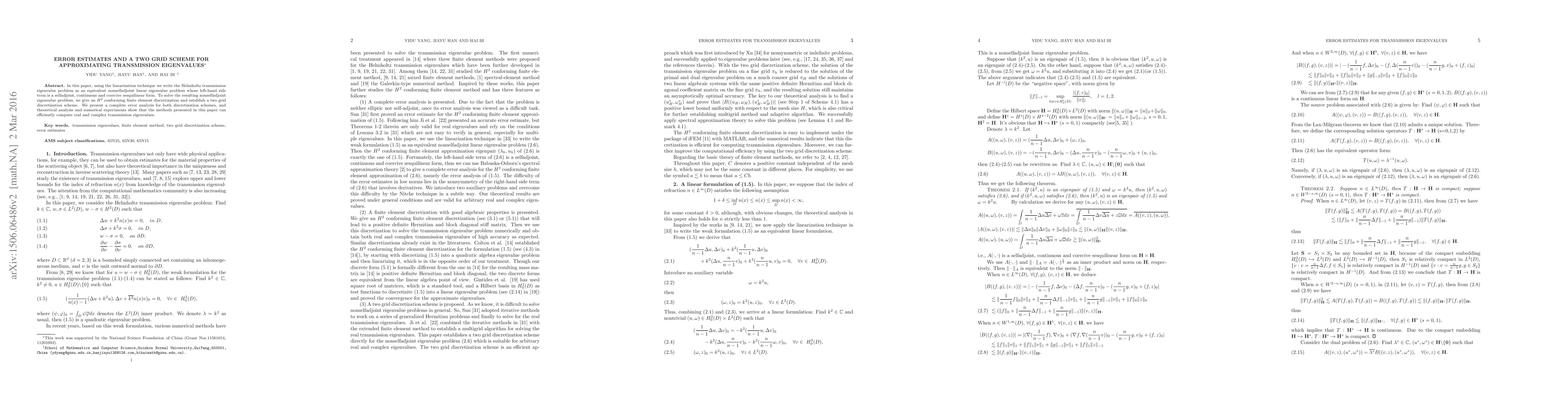 In this paper, using the linearization technique we write the Helmholtz transmission eigenvalue problem as an equivalent nonselfadjoint linear eigenvalue problem whose left-hand side term is a selfadjoint, continuous and coercive sesquilinear form. To solve the resulting nonselfadjoint eigenvalue problem, we give an $H^{2}$ conforming finite element discretization and establish a two grid discretization scheme. We present a complete error analysis for both discretization schemes, and theoretical analysis and numerical experiments show that the methods presented in this paper can efficiently compute real and complex transmission eigenvalues.