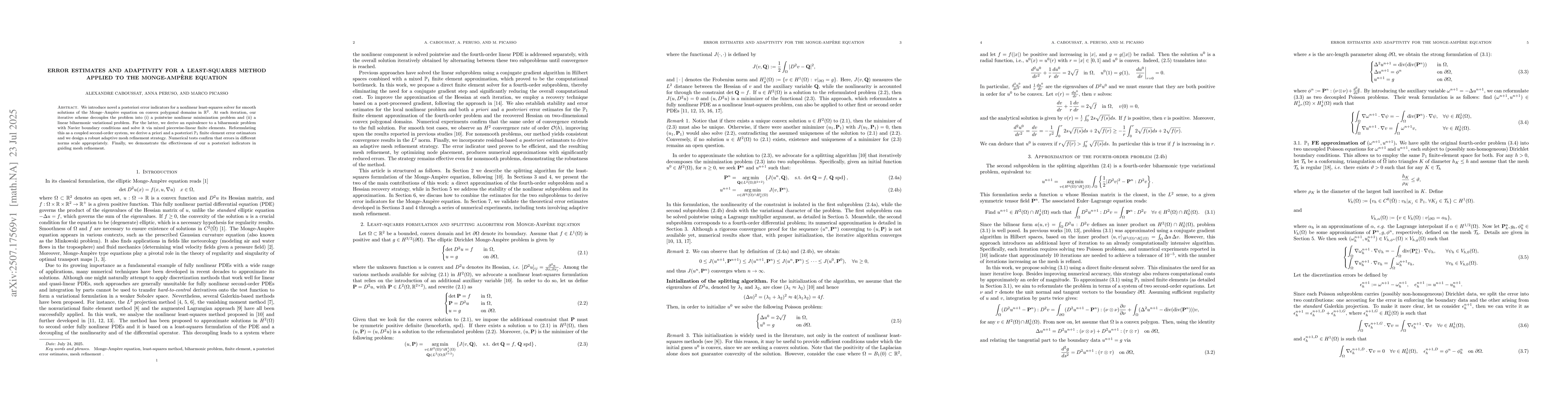We introduce novel a posteriori error indicators for a nonlinear least-squares solver for smooth solutions of the Monge--Amp\`ere equation on convex polygonal domains in $\mathbb{R}^2$. At each iteration, our iterative scheme decouples the problem into (i) a pointwise nonlinear minimization problem and (ii) a linear biharmonic variational problem. For the latter, we derive an equivalence to a biharmonic problem with Navier boundary conditions and solve it via mixed piecewise-linear finite elements. Reformulating this as a coupled second-order system, we derive a priori and a posteriori $\mathbb{P}^1$ finite element error estimators and we design a robust adaptive mesh refinement strategy. Numerical tests confirm that errors in different norms scale appropriately. Finally, we demonstrate the effectiveness of our a posteriori indicators in guiding mesh refinement.