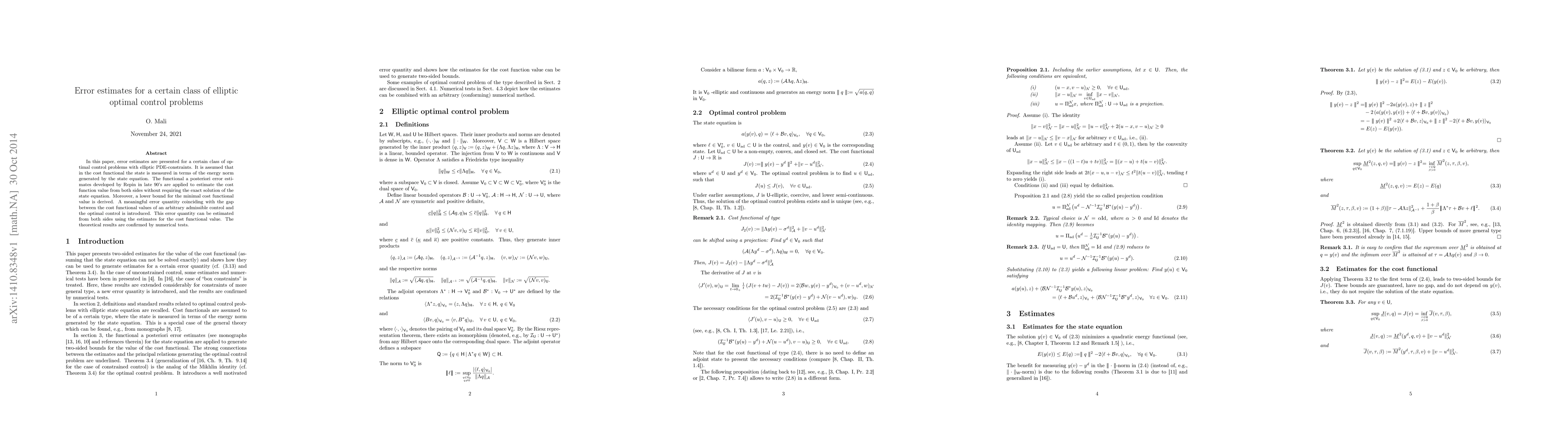 This paper presents error estimates for a class of elliptic optimal control problems, utilizing Repin's a posteriori error estimates to bound the cost function value without needing the exact state solution. It also introduces a meaningful error quantity to estimate the gap between admissible and optimal controls, confirmed by numerical tests.