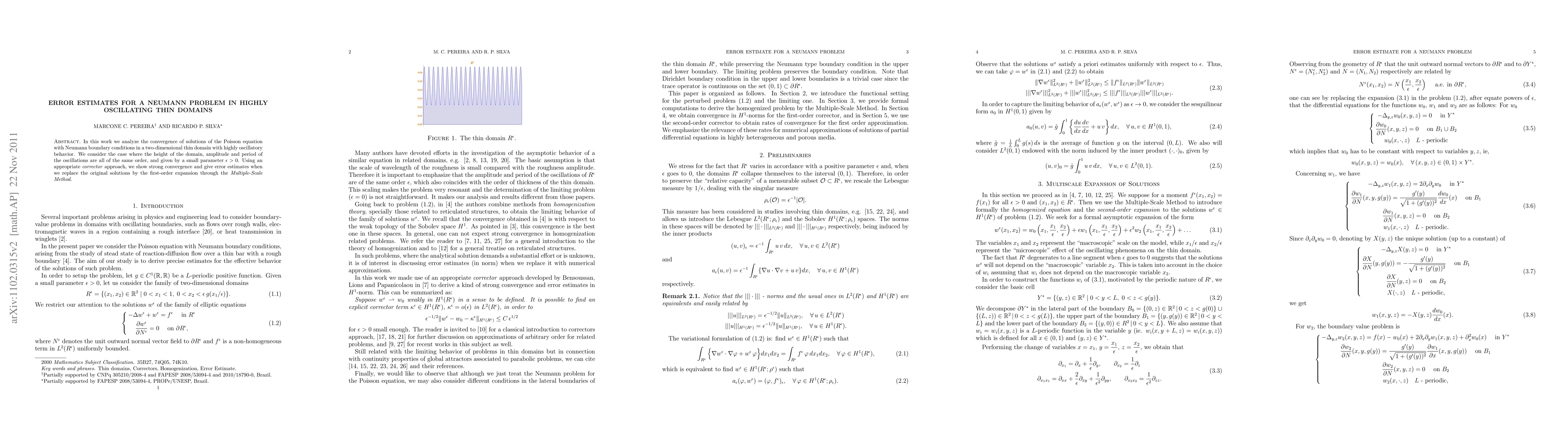 This paper analyzes the convergence of solutions for the Laplace operator with Neumann boundary conditions in highly oscillating thin domains, focusing on error estimates when the domain's height, oscillation amplitude, and period are all of the same order. It employs a corrector approach and the Multiple-Scale Method to derive strong convergence properties and error estimates.