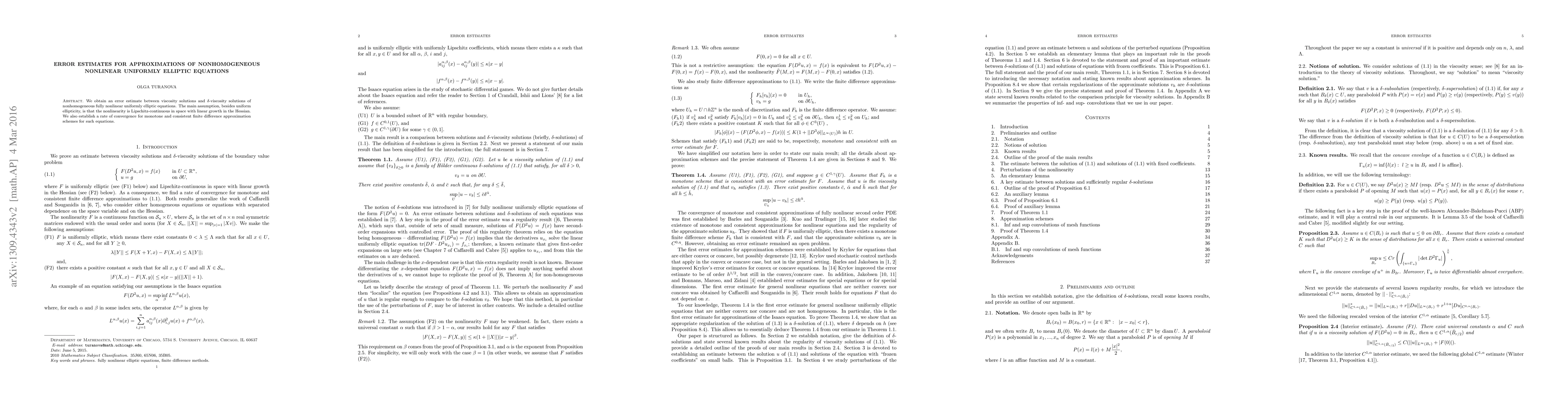 This paper provides error estimates for approximations of nonhomogeneous nonlinear uniformly elliptic equations, comparing viscosity and δ-viscosity solutions under Lipschitz-continuous nonlinearity and linear Hessian growth. It also establishes convergence rates for monotone and consistent finite difference schemes.
