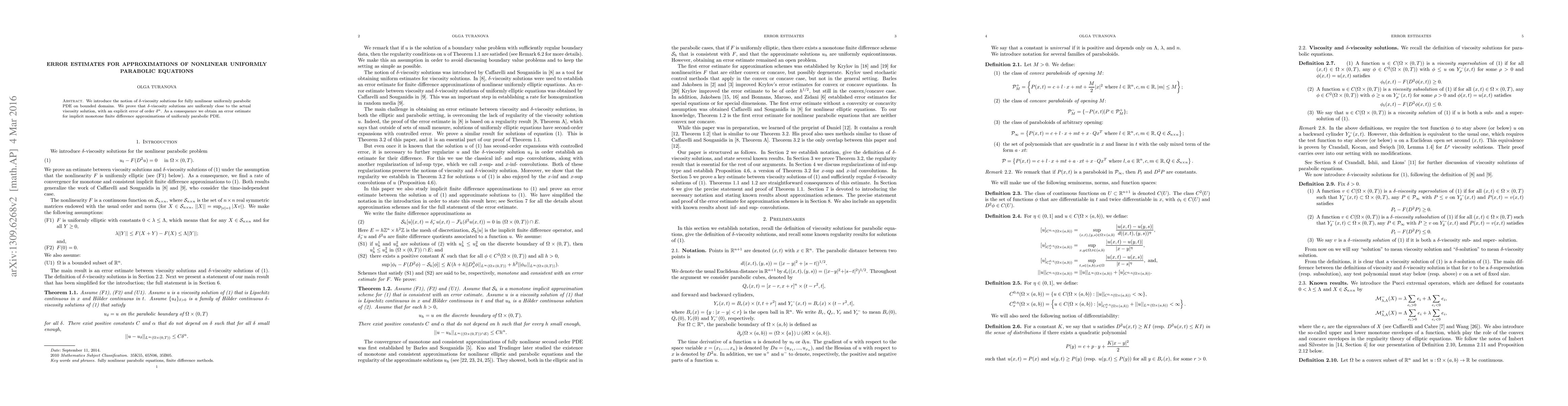 This paper introduces the concept of δ-viscosity solutions for fully nonlinear uniformly parabolic PDEs and demonstrates their uniform closeness to actual viscosity solutions. Consequently, it provides an error estimate for implicit monotone finite difference approximations of these PDEs.