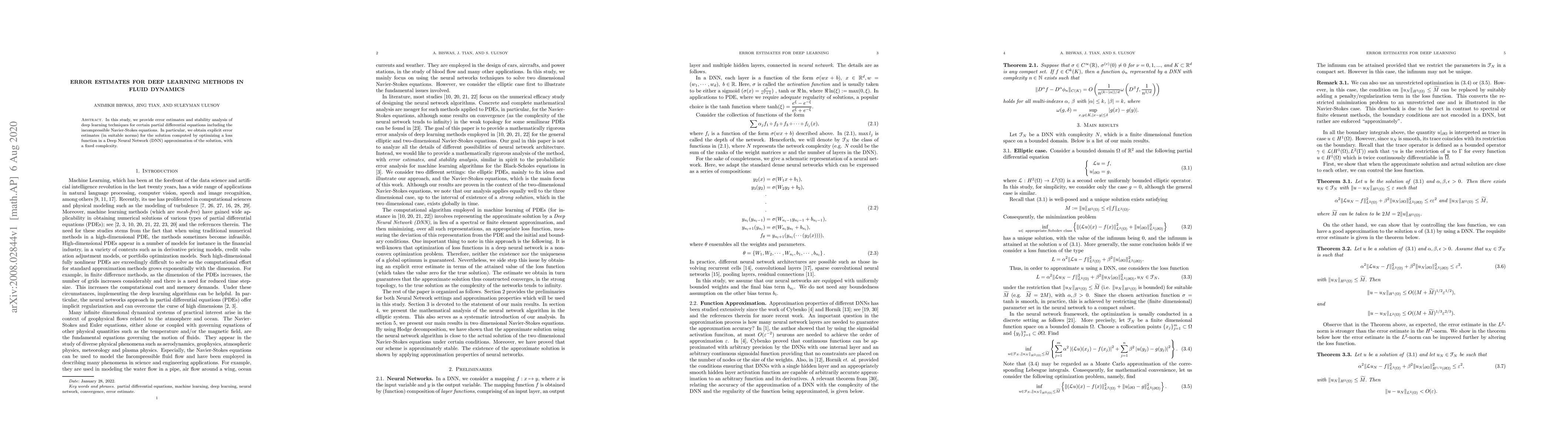 This paper presents error estimates and stability analysis for deep learning methods applied to solve partial differential equations like the incompressible Navier-Stokes equations, providing explicit error bounds for solutions computed via Deep Neural Network approximations.