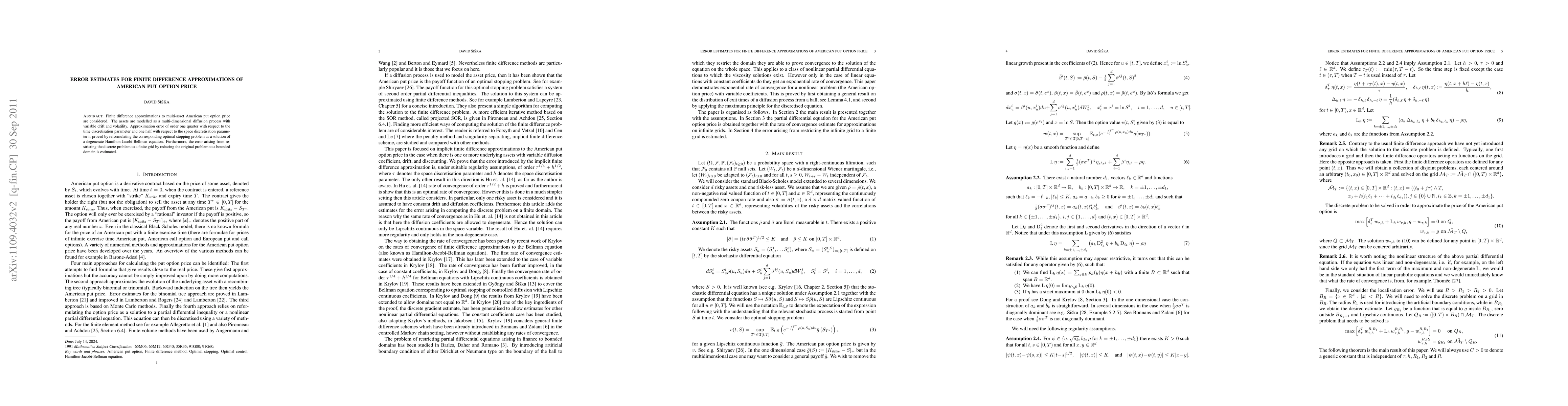 Finite difference approximations to multi-asset American put option price are considered. The assets are modelled as a multi-dimensional diffusion process with variable drift and volatility. Approximation error of order one quarter with respect to the time discretisation parameter and one half with respect to the space discretisation parameter is proved by reformulating the corresponding optimal stopping problem as a solution of a degenerate Hamilton-Jacobi-Bellman equation. Furthermore, the error arising from restricting the discrete problem to a finite grid by reducing the original problem to a bounded domain is estimated.